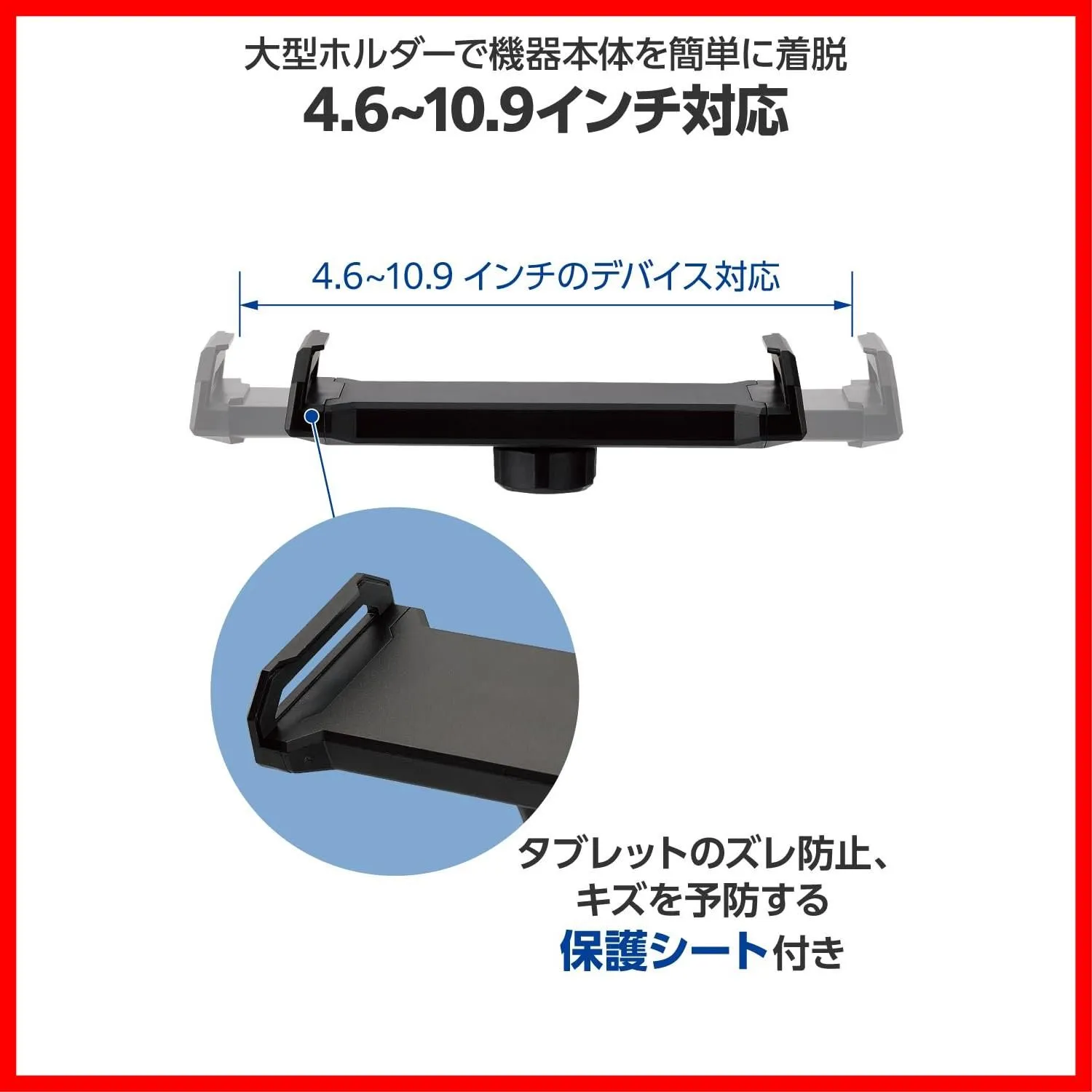 ■4.6インチ~10.9インチのタブレット・スマートフォン対応の大型ホルダーで、機器本体を簡単に着脱できます。