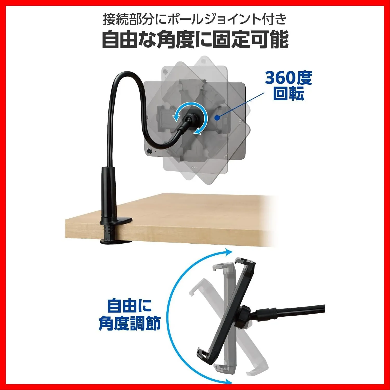 ■ホルダーとアームの接続部分はボールジョイントが付いており、360度回転させて自由な角度で固定することができます。