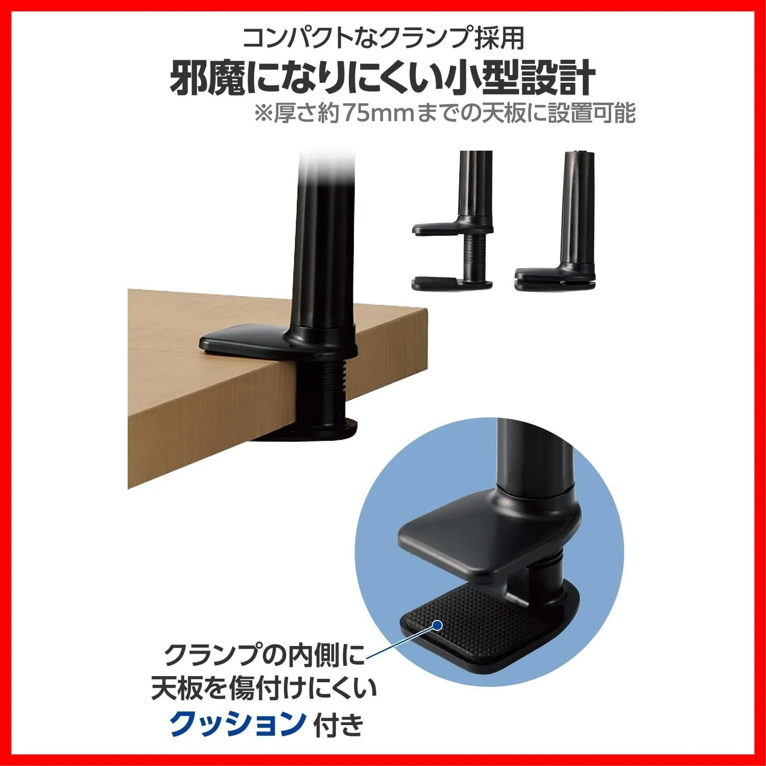 ■コンパクトなクランプを採用しているため、デスク周りやベッド周りに設置する際も邪魔になりにくいです。 ※厚さ約75mmまでの天板に設置可能。