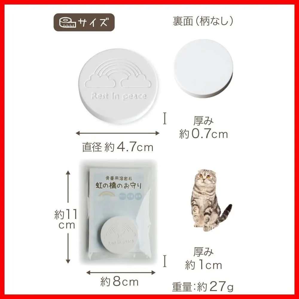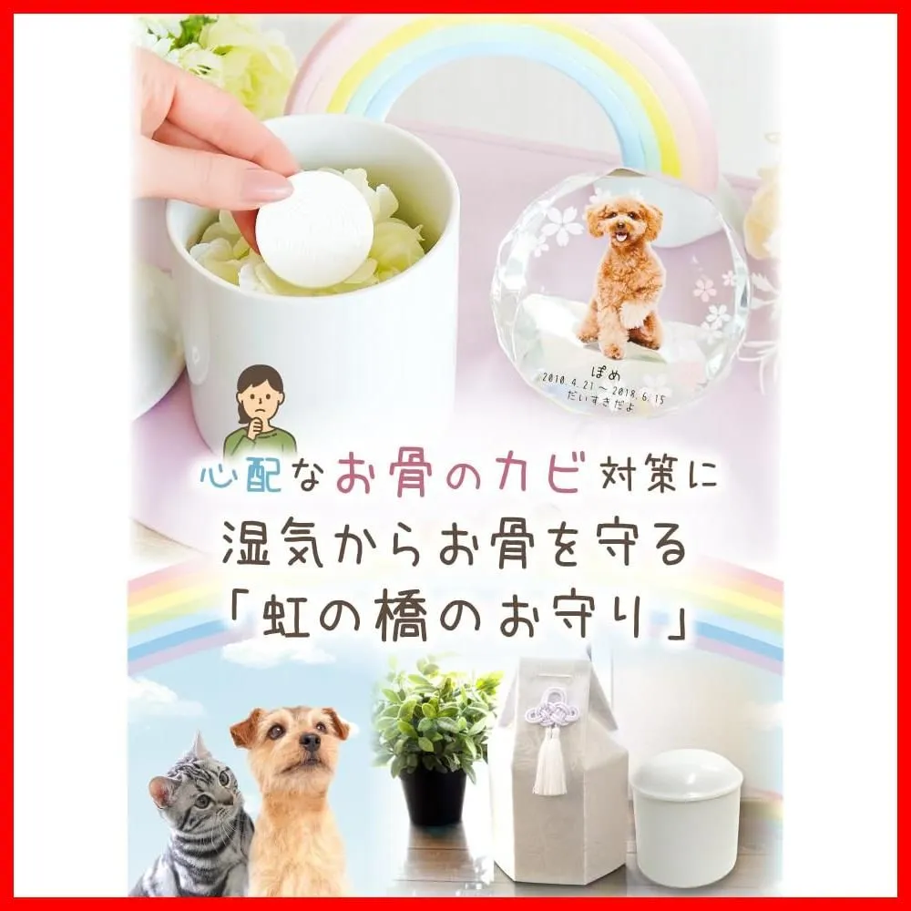 【お骨のカビ対策に】 お骨のカビが心配な方へ、ペット骨壷の除湿・調湿用としてつかえる溶岩石です。 大事なペットちゃんの遺骨を守るために、骨壷に入れてお使いいただける小さなお守りです。 珪藻土や木炭よりも吸収力・消臭力・抗菌性に優れた「溶岩石(ようがんせき)」でお作りしています。 気になるカビ菌が繁殖しづらい状態を保ち、骨壷の中を快適な状態にしてくれます。 心を込めて作られた「虹の橋のお守り」に使われている溶岩石は、火山から生まれた天然の多孔質素材。 目に見えない無数の穴が湿気を吸い取り、気になるニオイも優しく軽減してくれます。 「虹の橋」は、亡くなったペットたちが幸せに暮らすと言われる場所。 私たちがいつか再会するまで、安らかに過ごしてほしいという気持ちを形にしました。 かわいい小さなお守りが、「いつまでも大好き」という想いに寄り添います。 骨壷の中に直接お入れください。湿気は下に溜まるため、一番底に入れるのがおすすめです。 すでにお骨が入っている場合には一番上にポンと載せるだけでも大丈夫です。 1つでも効果はありますが、5寸以上はお2つ入れて頂くのがおすすめです。 ※粉骨(パウダー化)したお骨にもお使いいただけます。