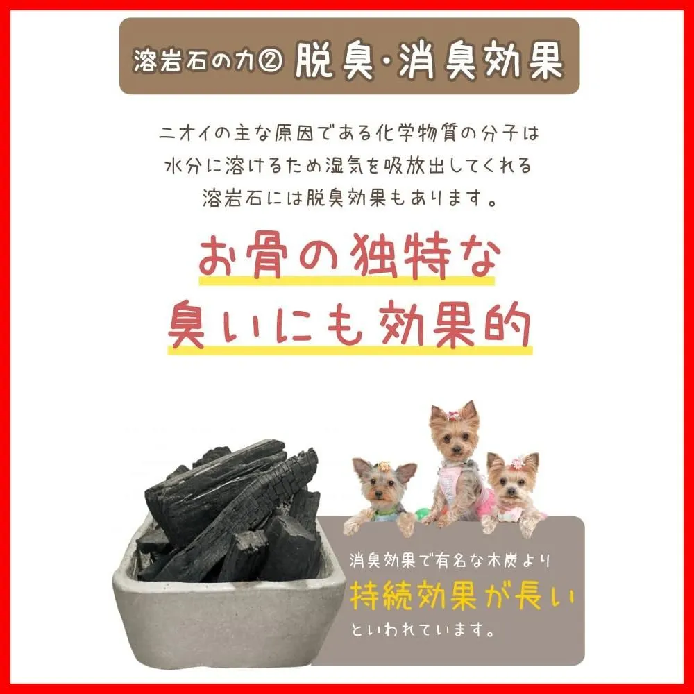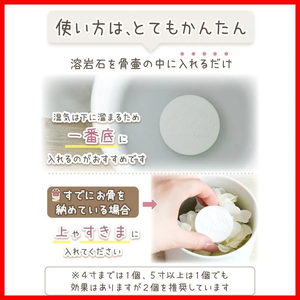 ●溶岩石はカビが生えないことをお約束するものではございません。 ※2025年5月に珪藻土→溶岩石にリニューアルしました。 大事なペットちゃんの遺骨を守るために、骨壷に入れてお使いいただけるミニサイズの溶岩石です。 湿気を吸収してカビ菌が繁殖しずらい状態を保ってくれるほか、脱臭効果にも優れています。 ━━━━━━━━━