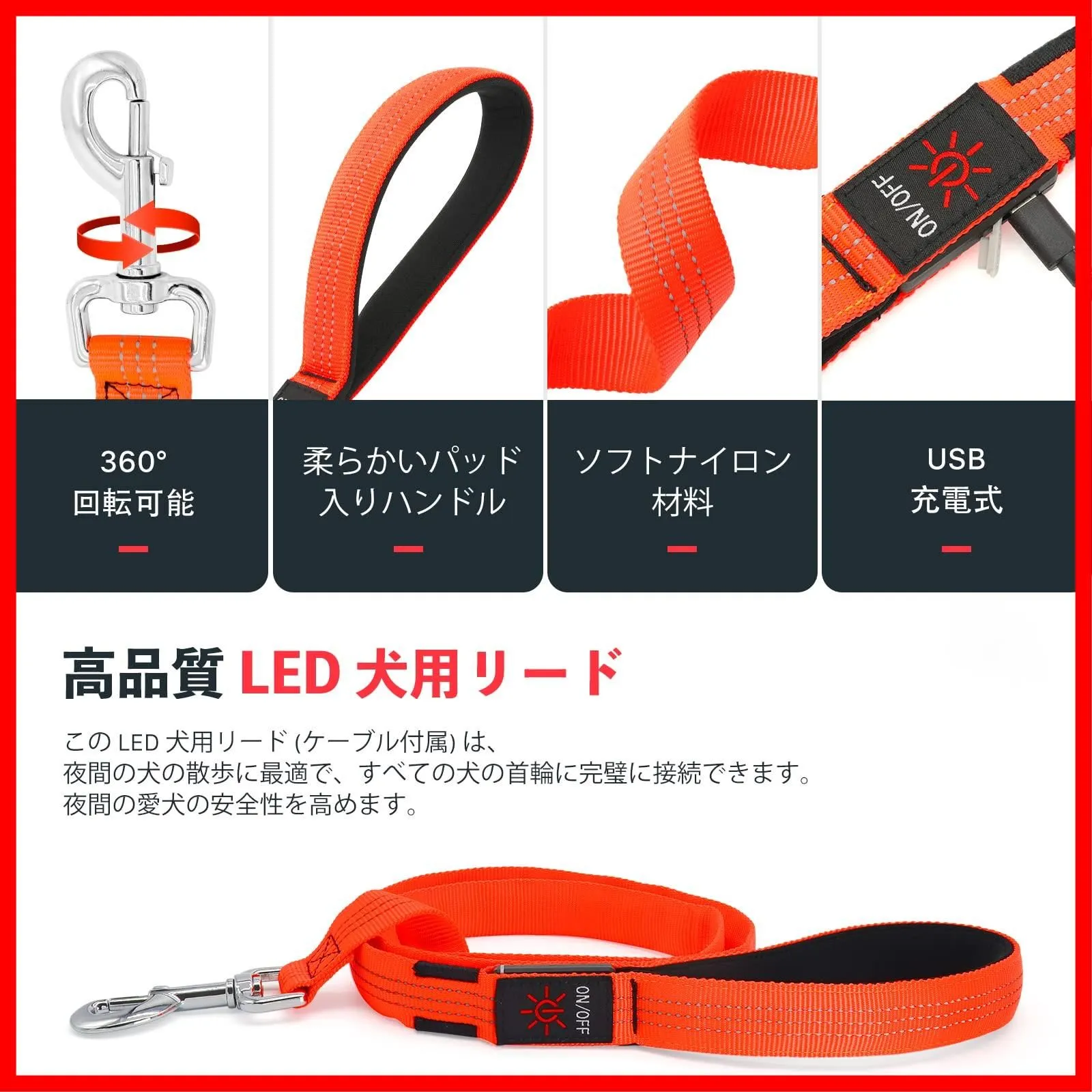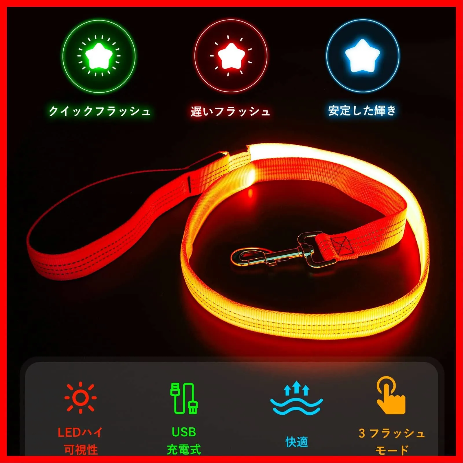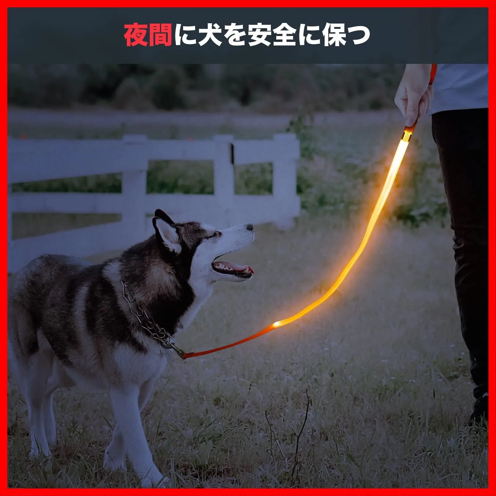犬 リード 光る 犬散歩ライト ledリード 1.2m 夜間 USB充電式 リードライト付き 視認距離500mで夜間安心 中型犬 大型犬 ペット用品 (オレンジ+反射糸3本)
