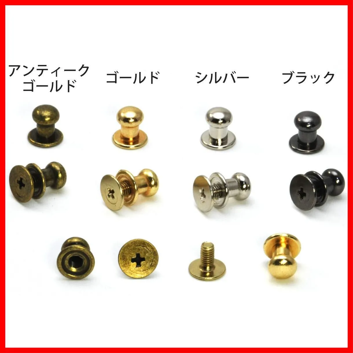 【 注 意 点 】 ・ フ ォ ロ ー頂 かないと確認が取れませんのでお手数お掛けしますが、ボ タ ン一つだけ ポ チ ッ とお願いいたします( * ?? ?*) ━━━━━━━━━━━ starPG ネジ式 6mm ギボシ 80個セット レザー用 レザークラフト ハンドメイド パーツ (4色 各20個セット) 頭部の直径が6mmのネジ式ギボシ80個セットです。カラーはアンティークゴールド、ゴールド、シルバー、ブラックの4色で、ミックスも選べます。 サイズ(約):頭部直径6mm、高さ8mm 重さ:一組約1.4g/主素材:亜鉛合金 ※ネジ穴が少し傾いていたり、多少の個体差があることがあります。ロットにより色味やディテールが多少異なることがあります。取り扱い説明書は付属しておりません。 ※ネジをいっぱいに締め込んだときの隙間は約1.5mmです。ネジは通常隠れて見えなくなるため、本体パーツとは色合いが異なることがあります。 6mm ネジ式ギボシ 80個セット レザー用 レザークラフト パーツ 頭部の直径が6mmのネジ式ギボシ80個セットです。カラーはアンティークゴールド、ゴールド、シルバー、ブラックの4色で、ミックスも選べます。 サイズ(約):頭部直径6mm、高さ8mm 重さ:一組約1.4g 撮影の状況やモニターの調整により、実際の色とは少し違って見えることがあります。 ネジをいっぱいに締め込んだときの隙間は約1.5mmです。 ━━━━━━━━━