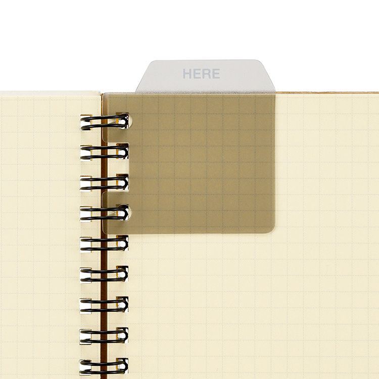 本体の二か所の穴をリングタイプのロルバーンのリングに取り付けて使用します。リングにしっかり固定できるため、すべり落ちることもありません。着脱が簡単で、マークしたいページ位置は自由に変更できます。ノートを閉じた状態で目印になる上部には、「HERE」の文字を配しています。使いたいページにすぐアクセスできる便利なアイテム。