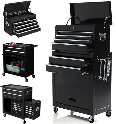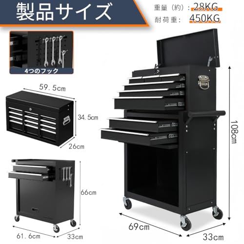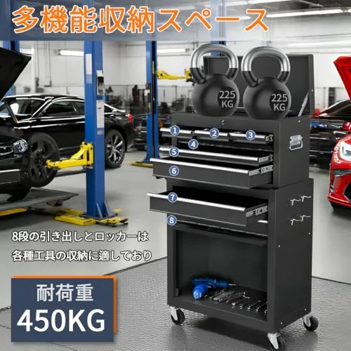 ツールキャビネット ツールトロリー 大容量 8段引き出し 耐荷重450kg 360°回転キャスター付き 工具カート 工具箱 工具収納 ロック付き 組み立て不要 運搬 作業 ガレージ 倉庫 修理工場用(ブラック,62*33*108cm)★m