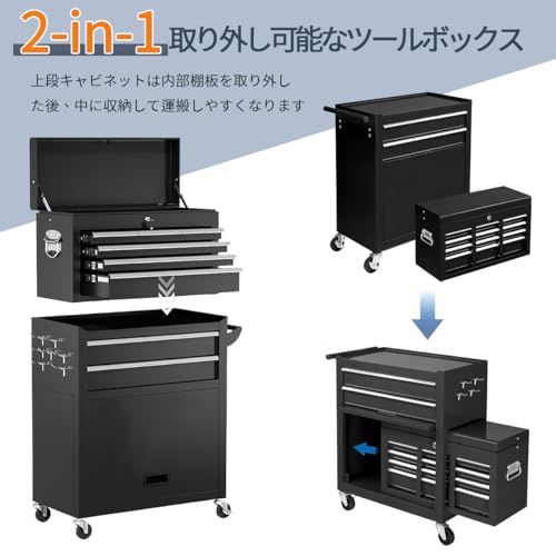 【多機能収納スペース】ツールボックスはスペースが広く、8段の引き出しとロッカーは各種工具の収納に適しており。また、サイドパネルが付き、フックで工具類を引っ掛けます。レイヤードデザインにより、適切に収納および整理でき、アイテムをより便利かつ迅速に取り出すことができます。
