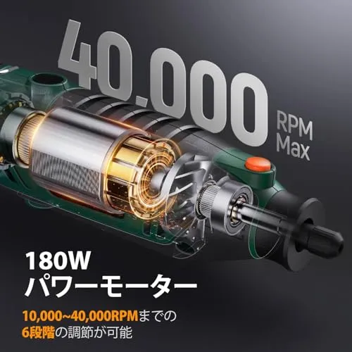 【6段階可変速&180W】DEPSTECHのプロフェッショナルなミニルーターは、10,000から40,000RPMまでの6段階の速度調節が可能です。木材、ガラス、金属、プラスチック、翡翠など、様々な素材に微妙な彫刻をする際に、ロータリーツールの速度を簡単に制御できます。強力な180Wの純銅モーターは、作業効率を30%向上させます。