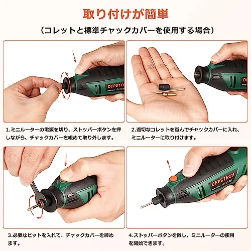 【ユニバーサルキーレスチャック】このパワフルな電動リューターは、ユニバーサルキーレス三つ爪チャックを備えています。これにより、レンチやコレットを使わずに素早く簡単に電動リューターにアクセサリーを交換することができ、.4mm3.2mmのシャンクのアクセサリーを受け入れることができます。他の製品よりも広く互換性があります。