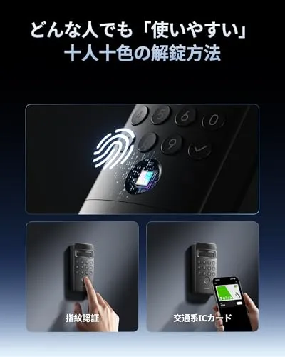 【多様な解錠スタイルで使いやすい】指紋認証やパスワードの入力をはじめ、SuicaやPASMOなどの交通系IC、NFCカードなどを使った解錠にも対応します。また、交通系ICカードをスマホやスマートWatchに登録すれば、スキャンするだけで解錠できるように。指紋の登録上限は100個までで、家庭用からオフィス用までご利用いただけます。通常用/期間限定/ワンタイム/緊急用、合計4種類のパスワードを設定することができ、家族との同居、友人の短期滞在、家事代行サービスなどあらゆるシーンに合わせてパスワードを使い分けられるのも魅力です。