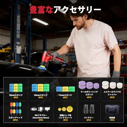 【豊富な付属品】ポリッシャー本体、2個バッテリー、急速充電器、30/50/75mmスポンジディス