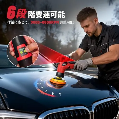 【プロ仕様超精密ポリッシャー】3000-6500 RPM広範囲変速で、車体スワール痕からドアミラー裏?シンク角部など狭小箇所の頑固汚れまで、精密研磨で完全除去!小型パッド (狭小エリア専用)と30/50/75mm標準パッド(局部仕上げ用)を標準装備。狭小筒所の精密研磨から平面艶出しまで全対応、軽自動車大型SUVまで多車種に適用可能!