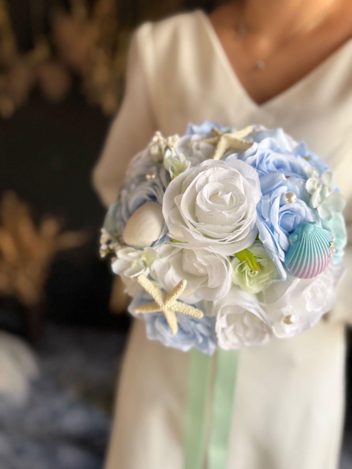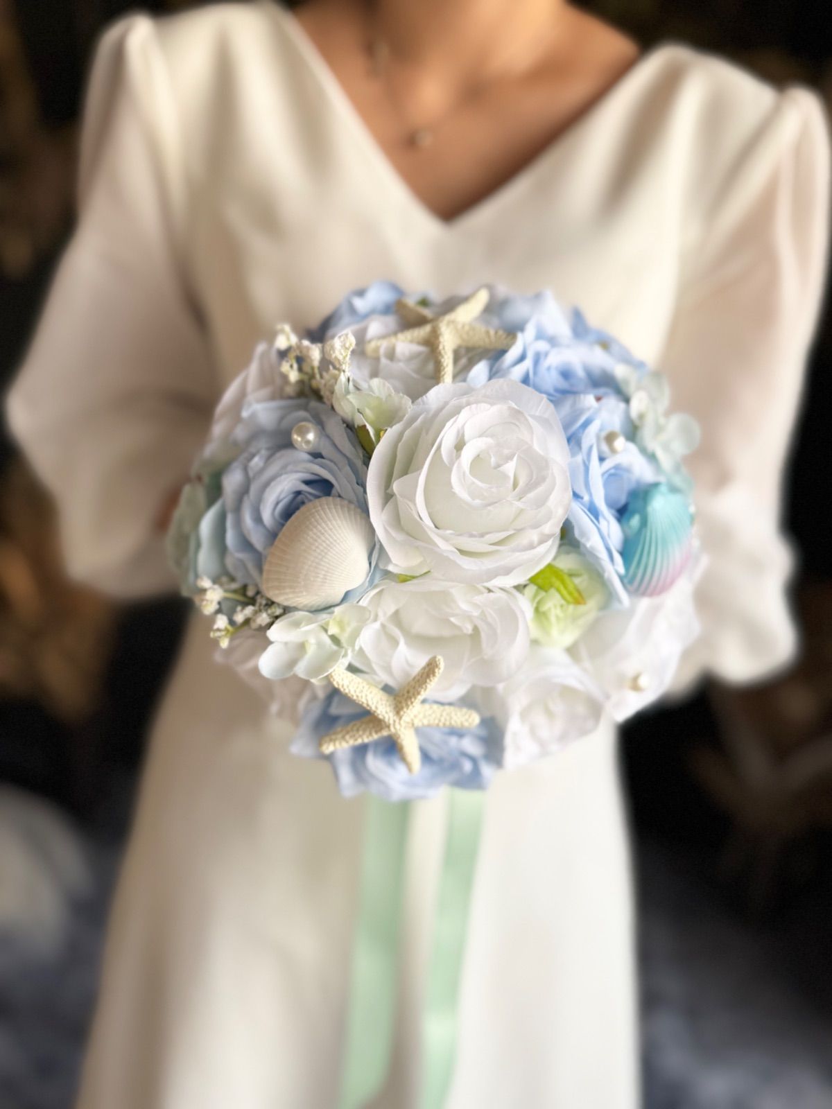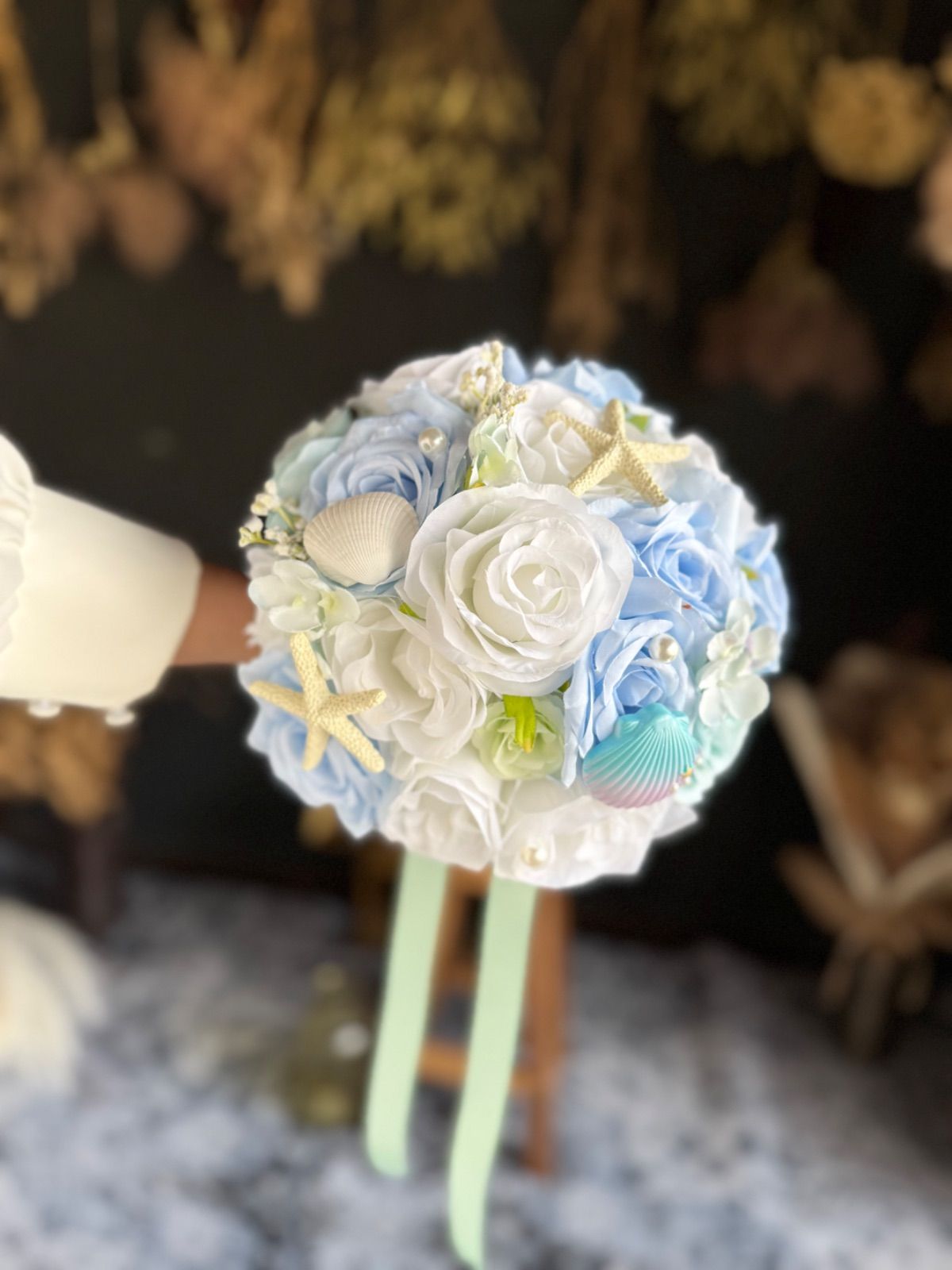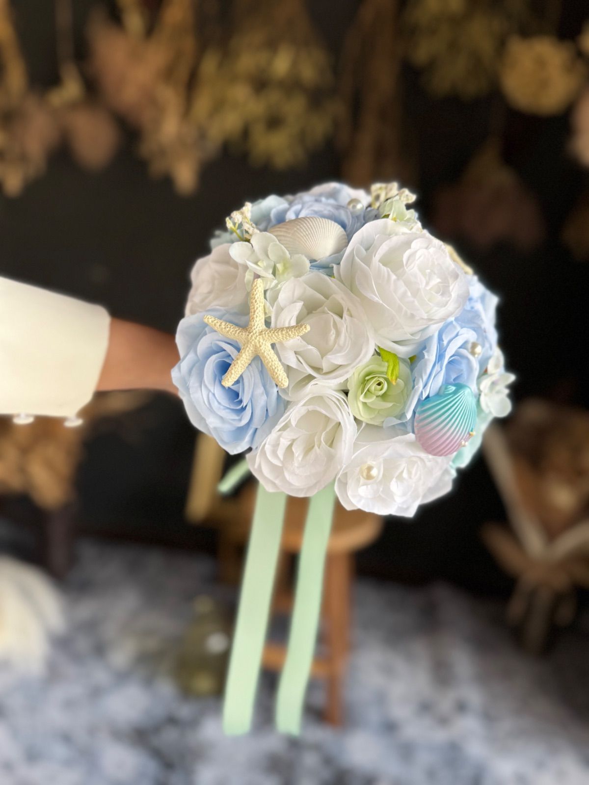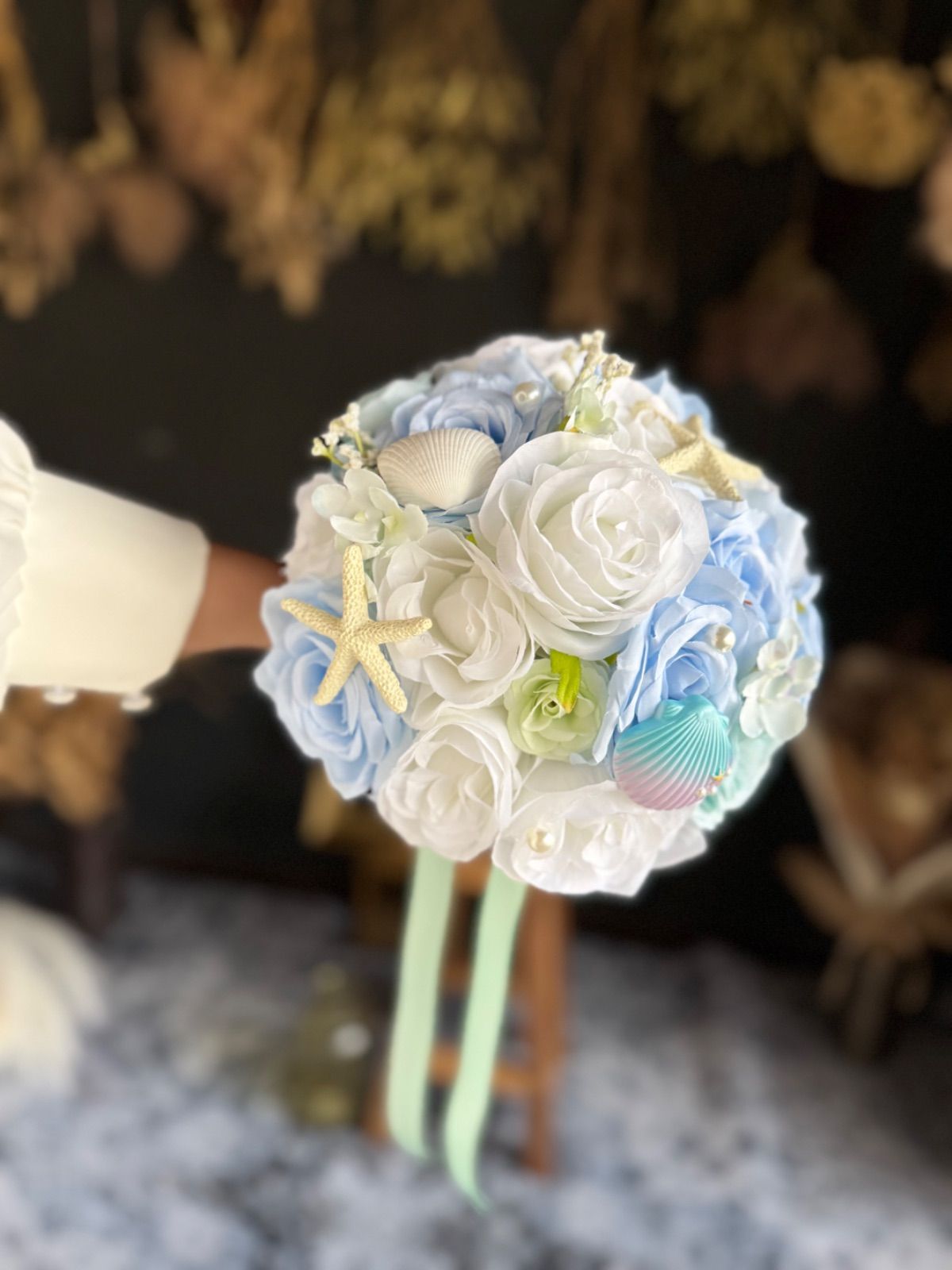 貝殻やパールのついた海や人魚をイメージした可愛いラウンドブーケです♡