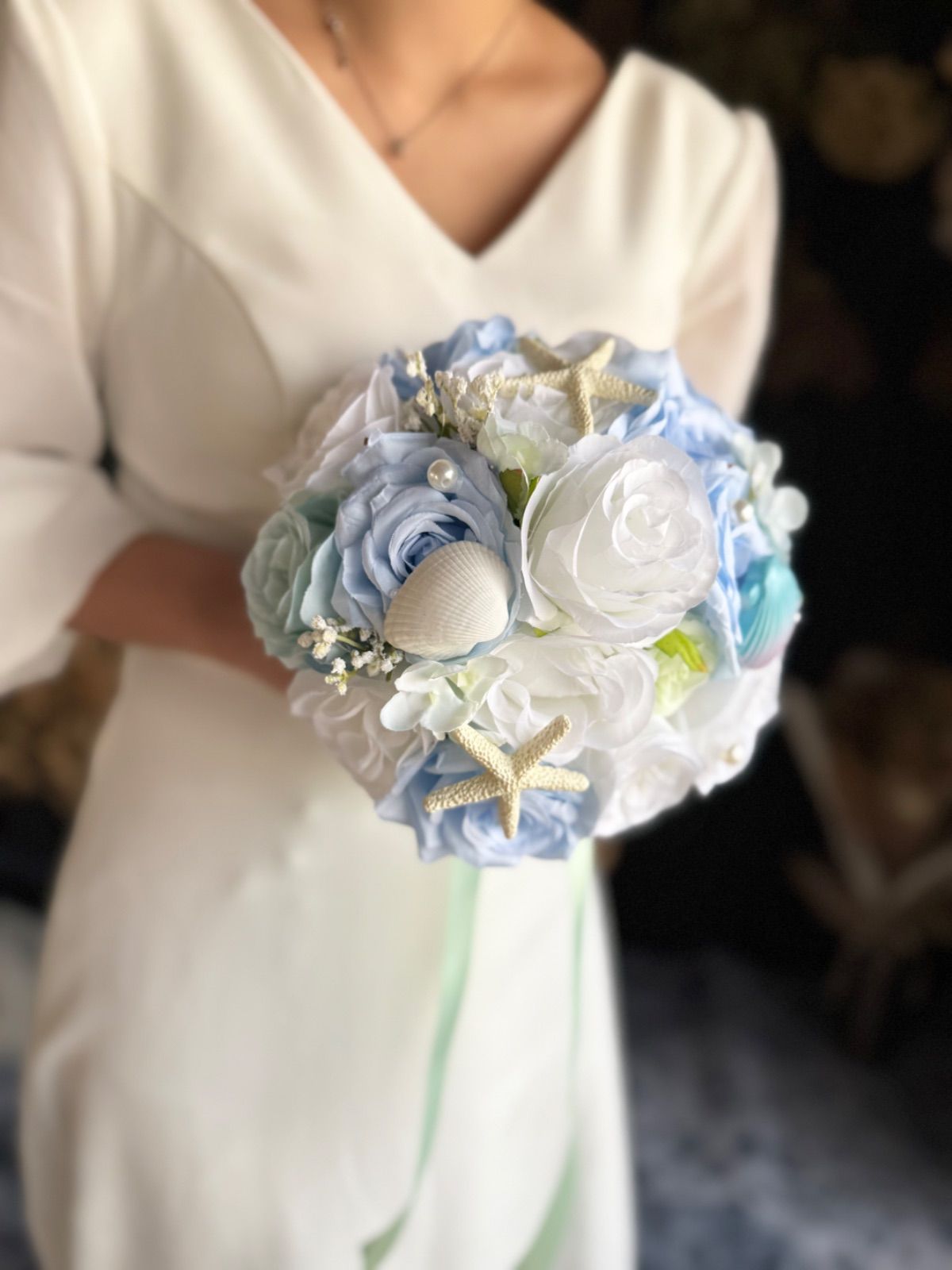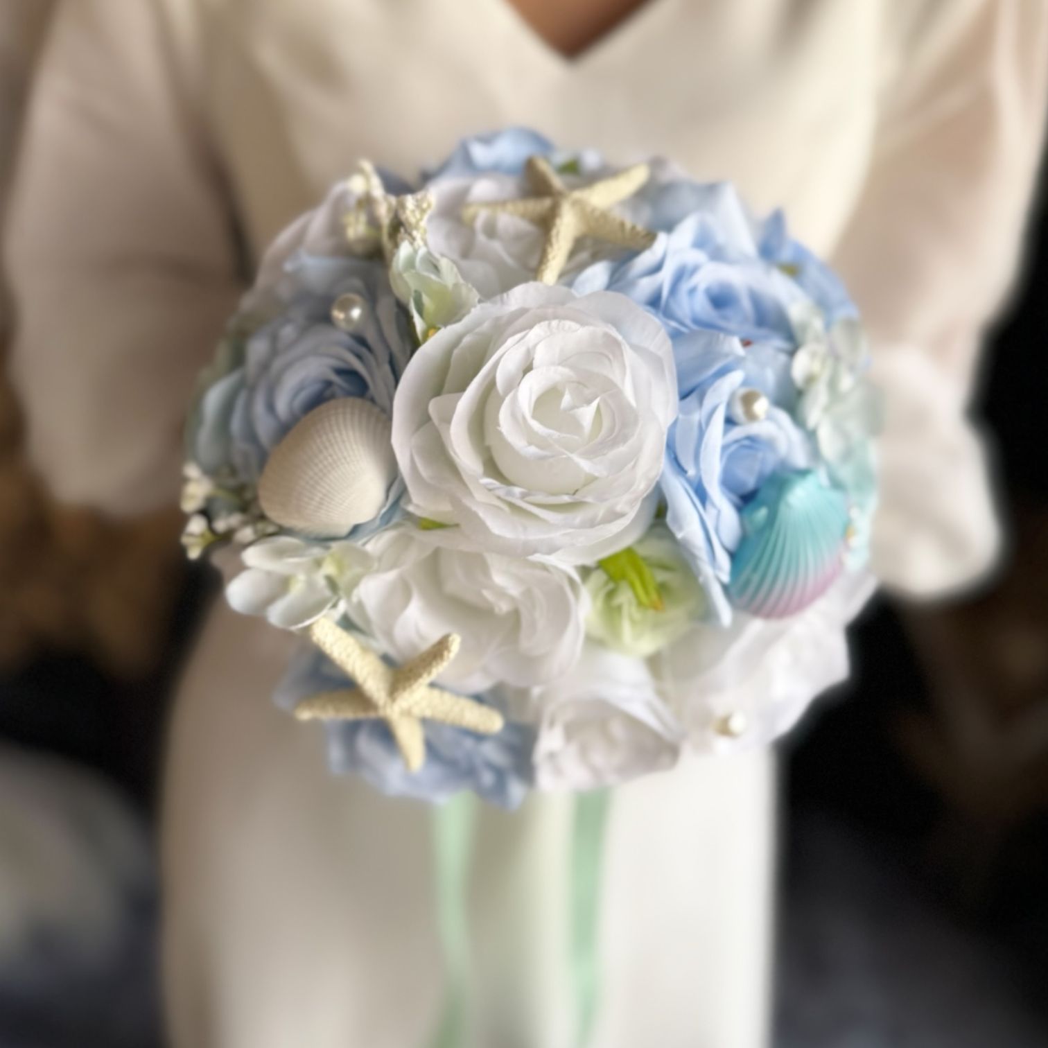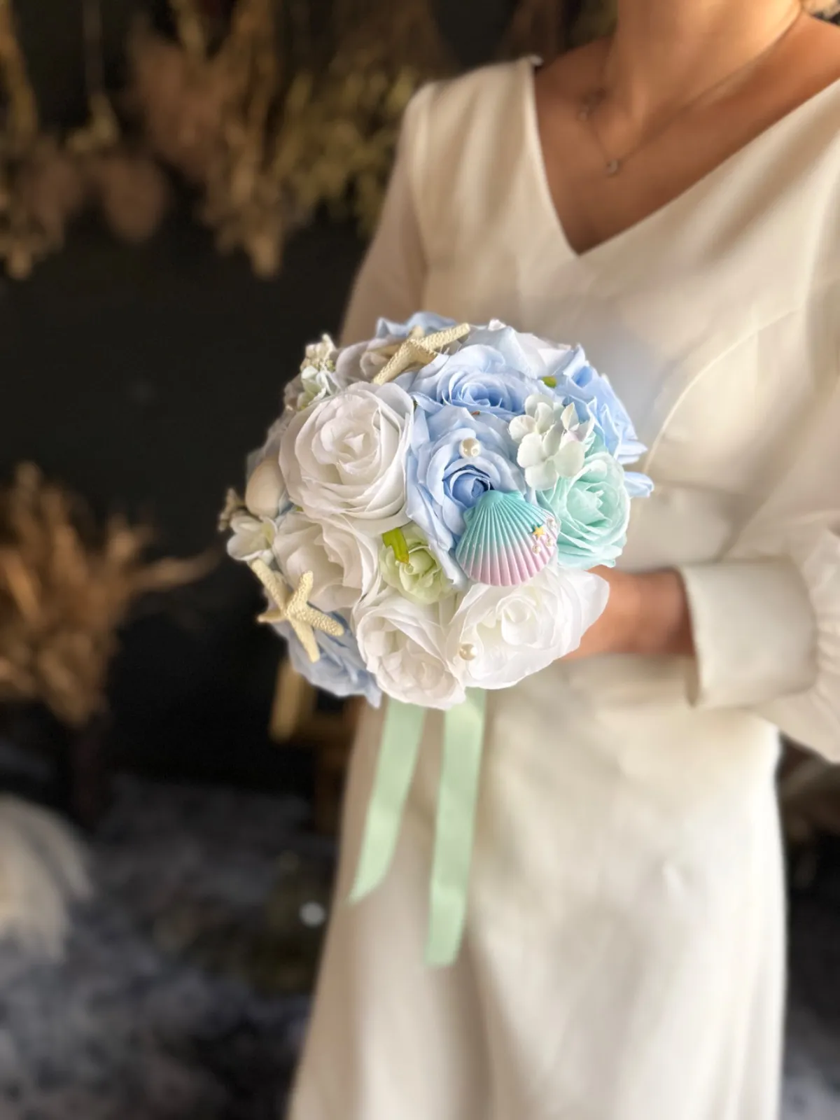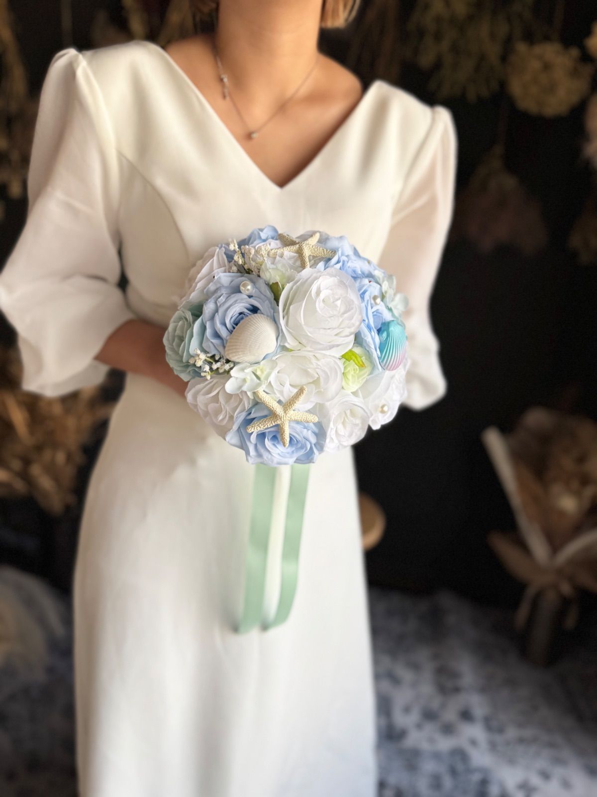 貝殻やパールのついた海や人魚をイメージした可愛いラウンドブーケです♡