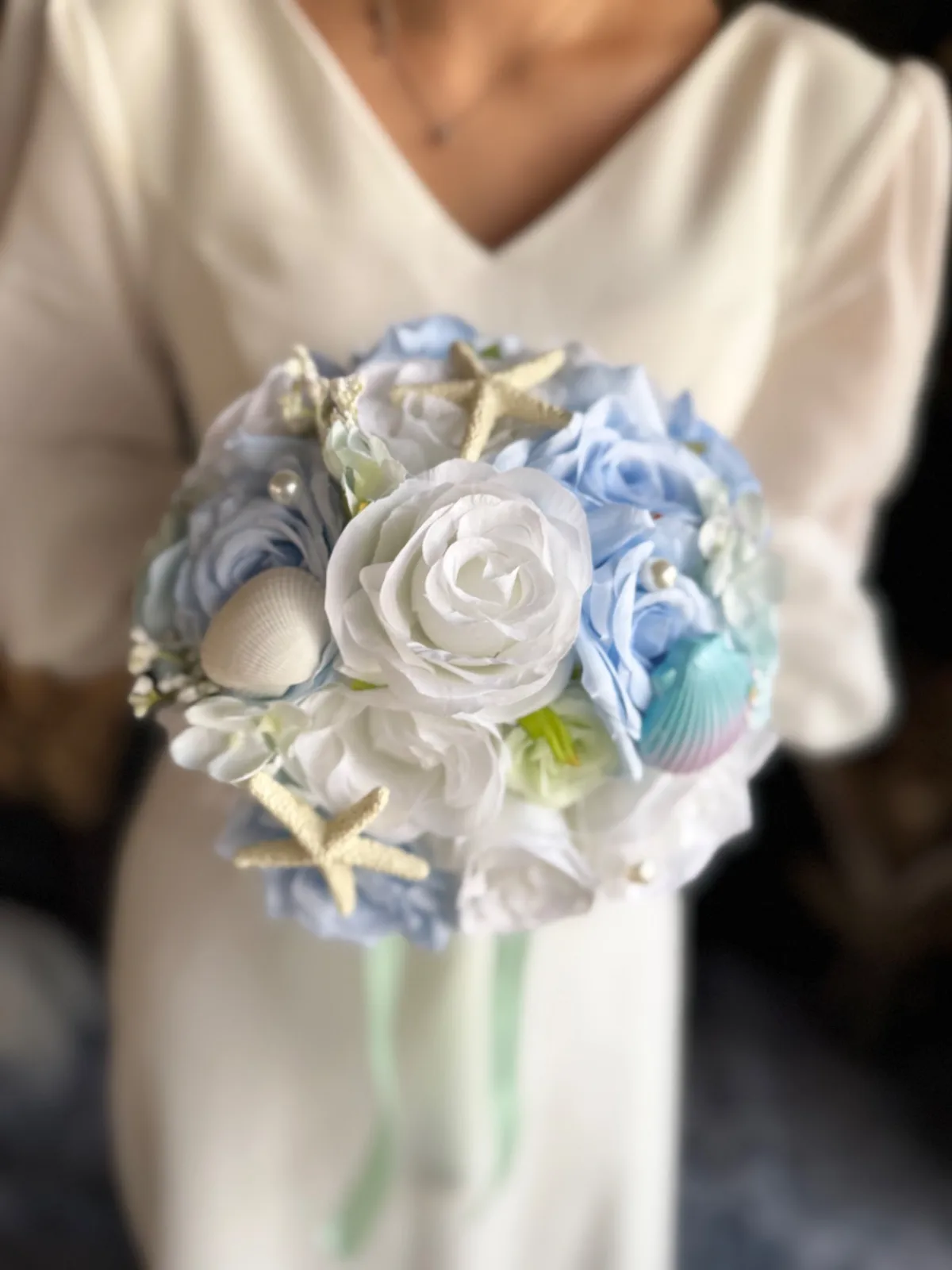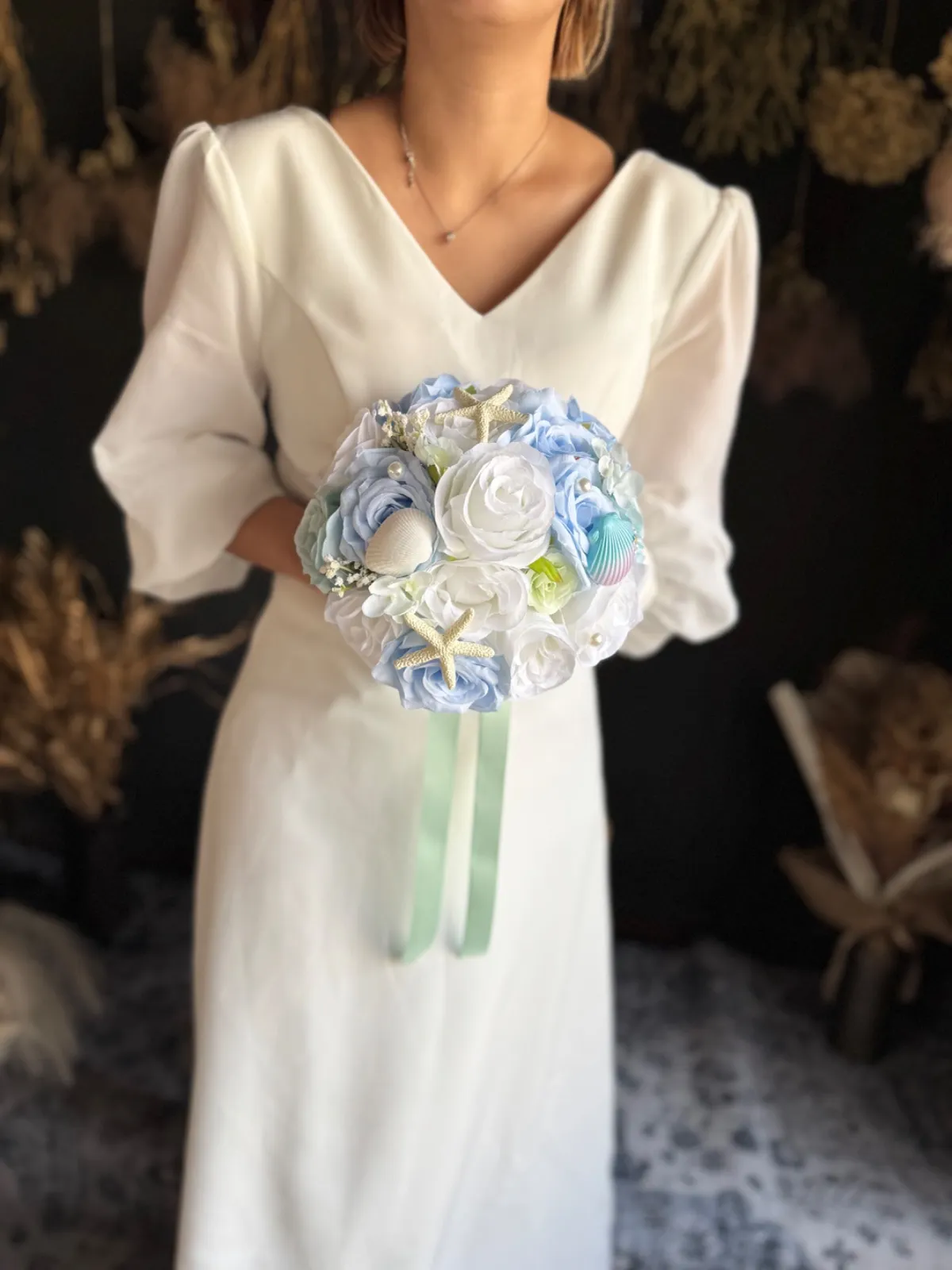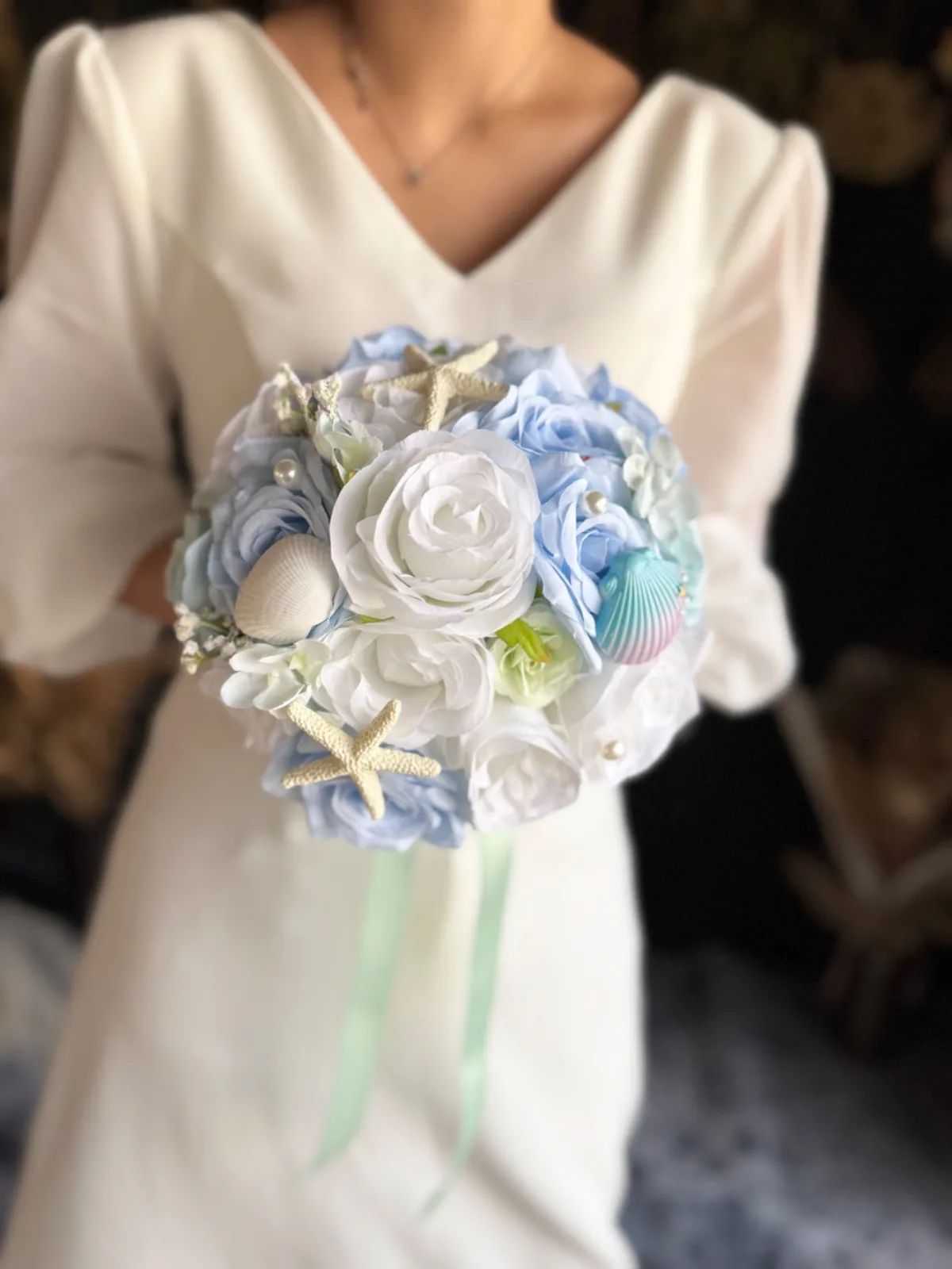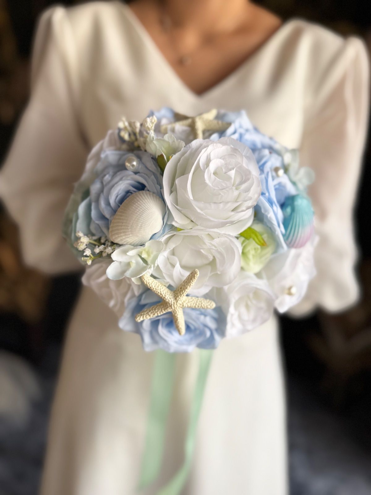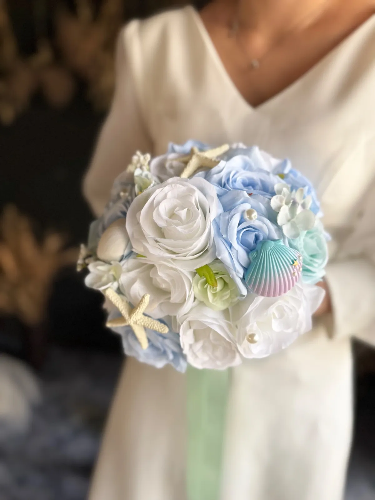 貝殻やパールのついた海や人魚をイメージした可愛いラウンドブーケです♡