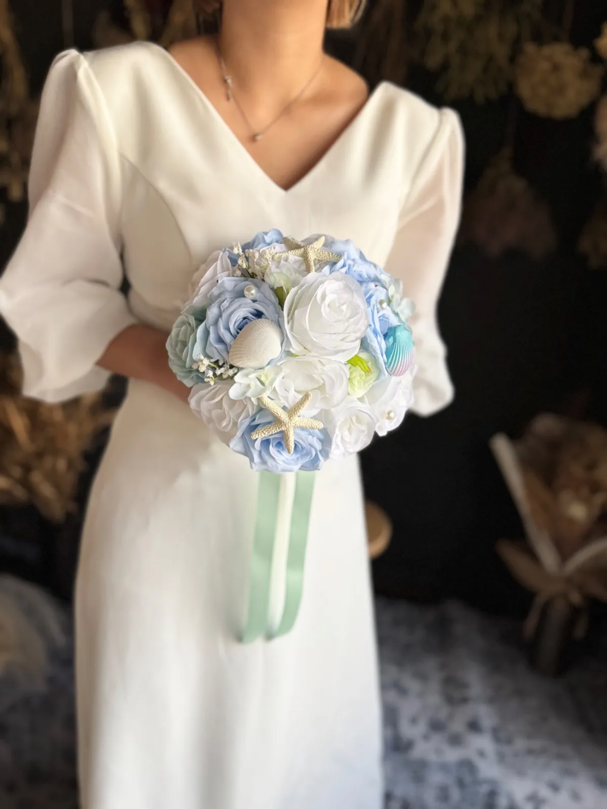 白バラ×水色×ミント貝殻ラウンドブーケ☆ブートニア