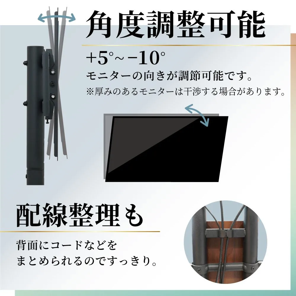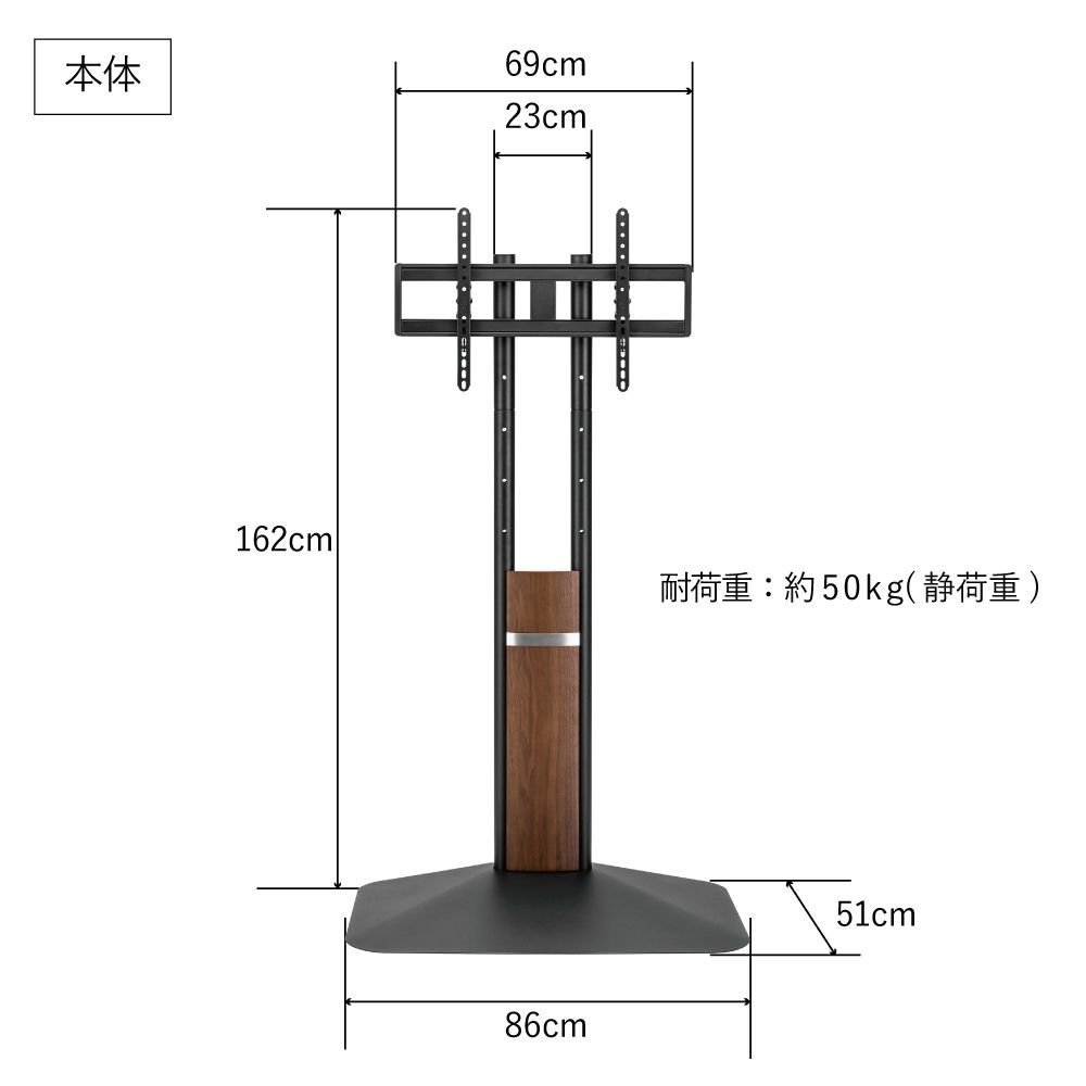 【仕様】 サイズ幅860×奥行505×高さ1615(mm) 重量約20kg 耐荷重約50kg(静荷重) 対応規格VESA規格(100×100、150×100、200×100. 150×150、200×200、300×200、400×200、300×300. 400×300、400×400、600×400) 対応モニターサイズ32~75インチモニター対応 前後角度調節+5°~-10° 材質プラスチック、スチール、木製ベニヤ付きMDF セット内容本体一式、ネジー式、工具一式、日本語取扱説明書 内容品の詳細はマニュアルをご確認ください。 注意事項・必ず壁に寄せて設置してください。 *プラスドライバー(モニター取り付けの際に必要)は付属しておりません。別途ご用意ください。 パッケージサイズ幅1120×奥行555×高さ135(mm) パッケージ込み重量約24kg オプション品3種は別売りとなりますので、ご入用の方はご購入前にお申し付けください。 新品未開封です! 外装(段ボール)に直接発送伝票を貼って発送いたします!