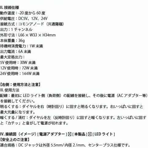 ■ 詳細スペック・電気仕様 動作電圧: DC 5V / 12V / 24V 対応 最大許容電流: 6A(大容量モデル) 最大定格出力: DC 5V使用時:30W未満 DC 12V使用時:72W未満 待機電力(静止電力): 1W未満 動作温度: -20℃~60℃ 極性: センタープラス(標準仕様)
