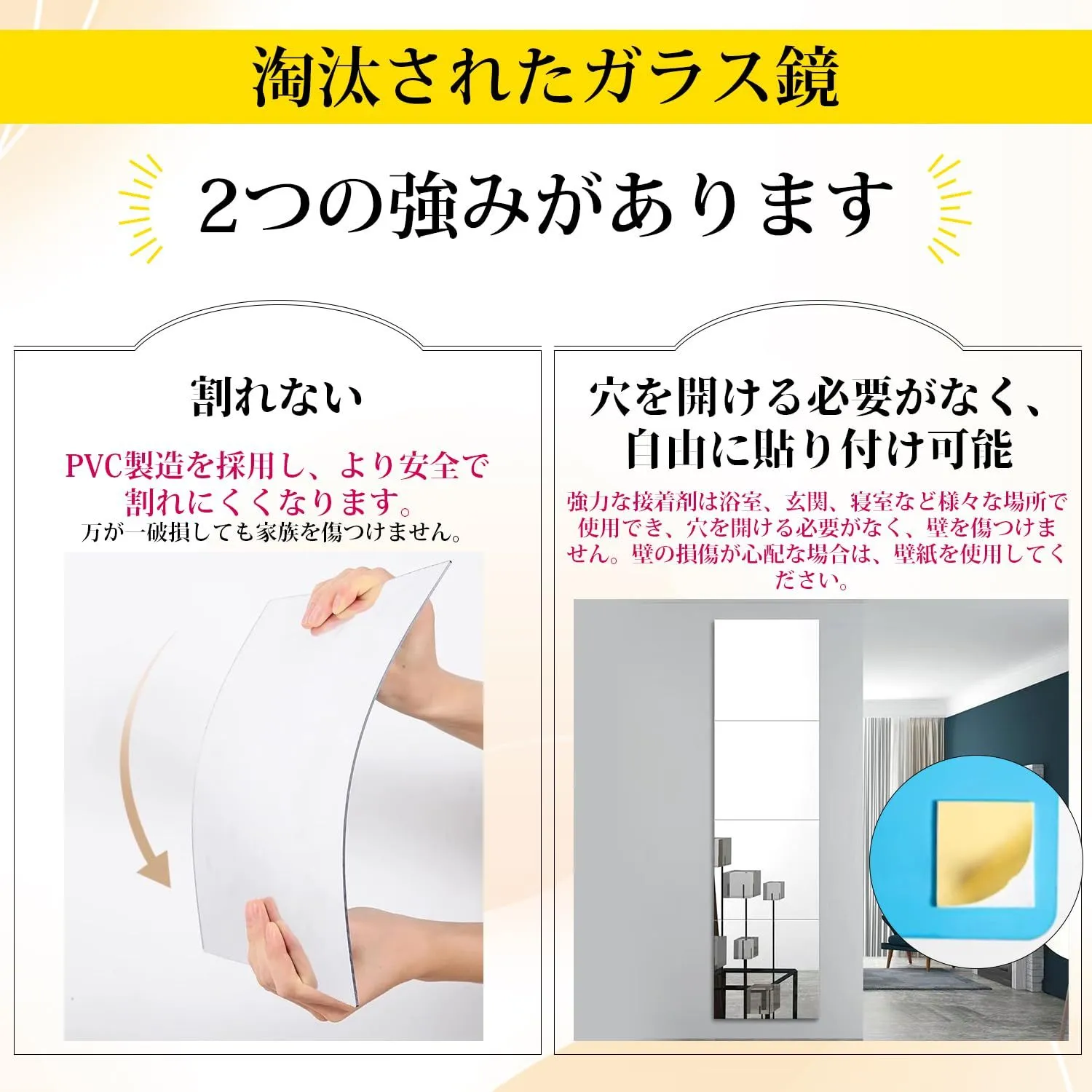 【アクリルミラーで怪我ゼロへ】ps素材を採用、軽量で堅牢、意外に落ちてもリスクを大幅に低減します飛散防止、軽量設計の為、万が一落下しても鏡に比べ怪我のリスクが低下します地震など災害時にも割れる心配が無く、小さなお子様やペットの安全対策としてもオススメです