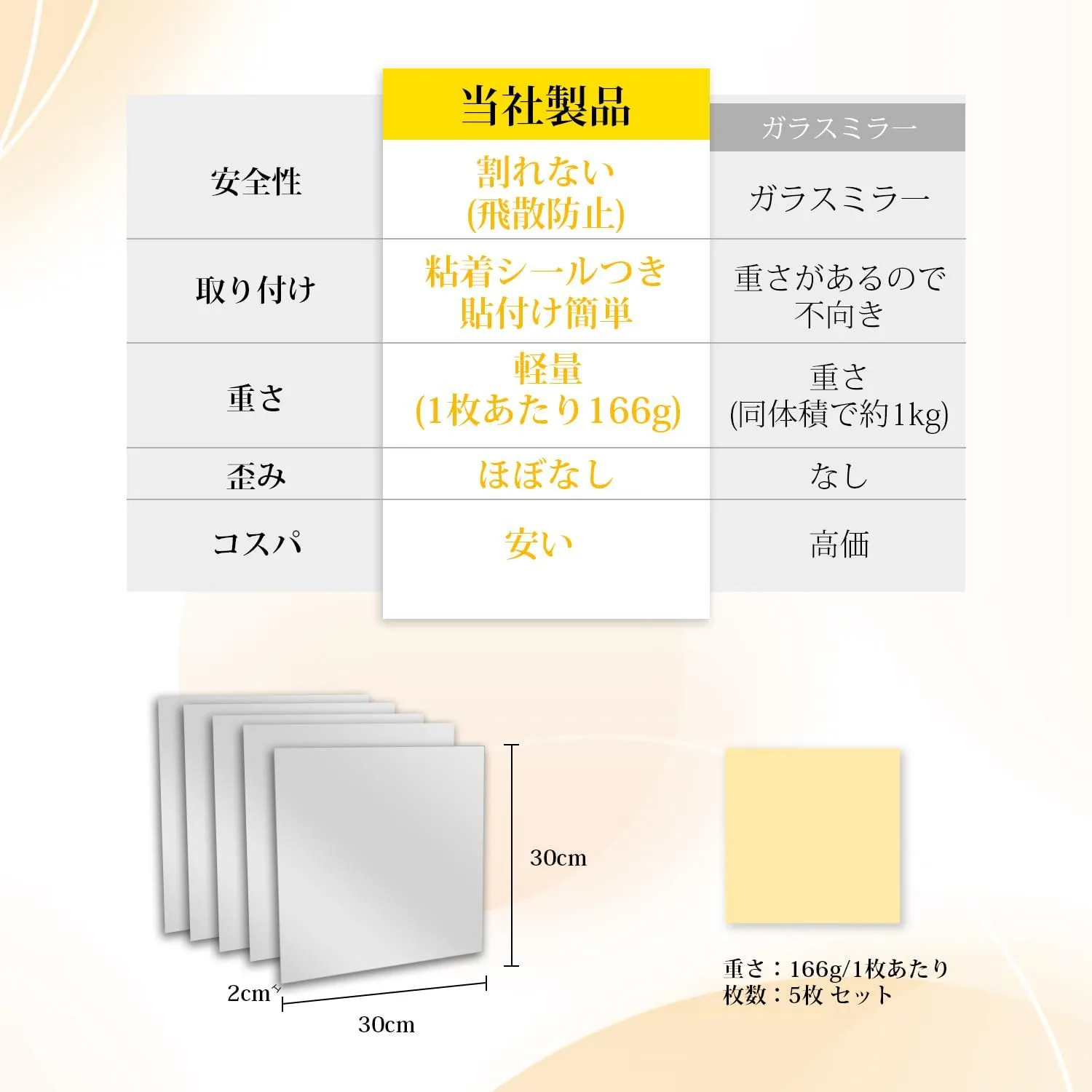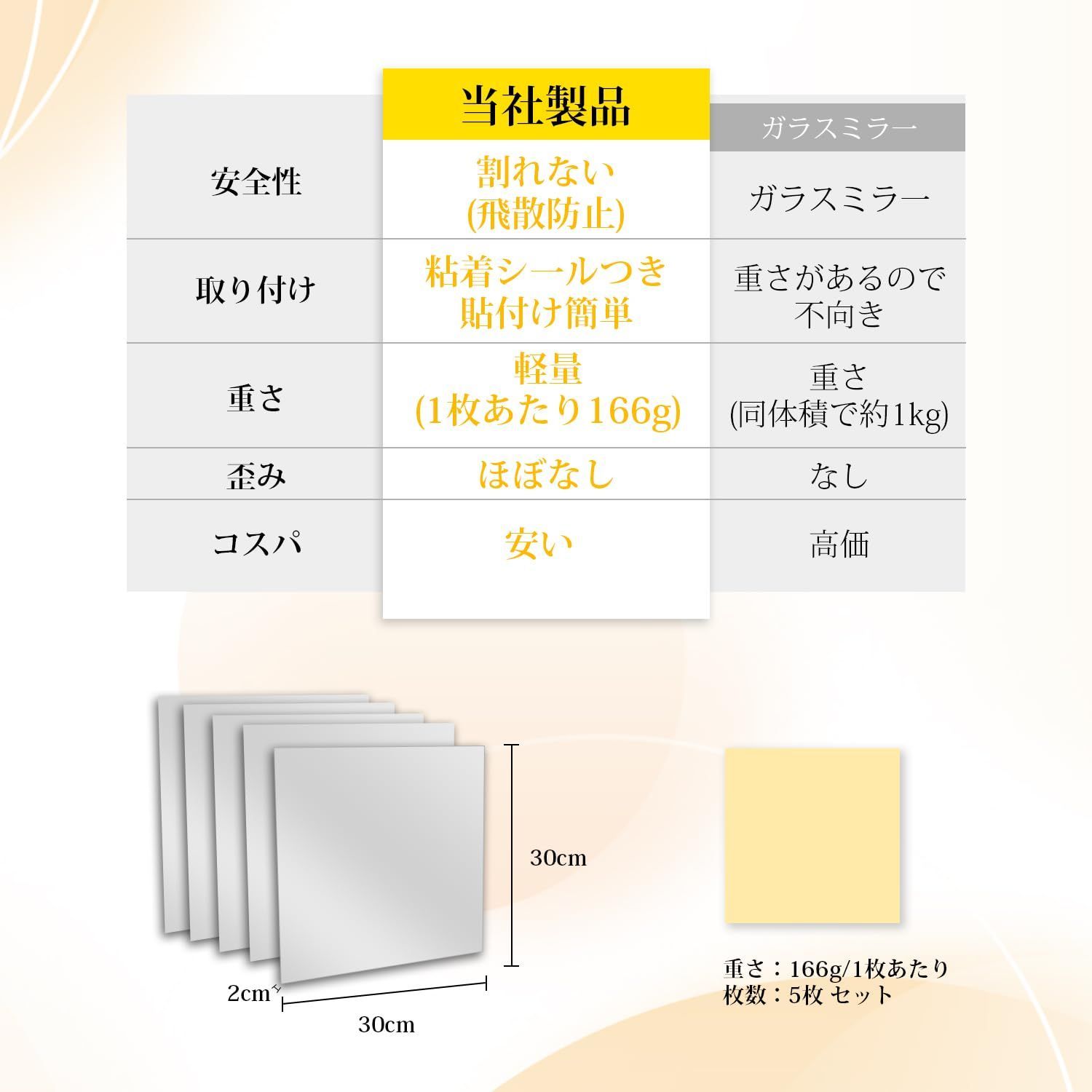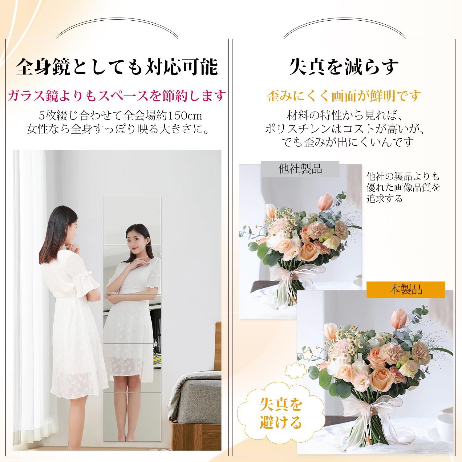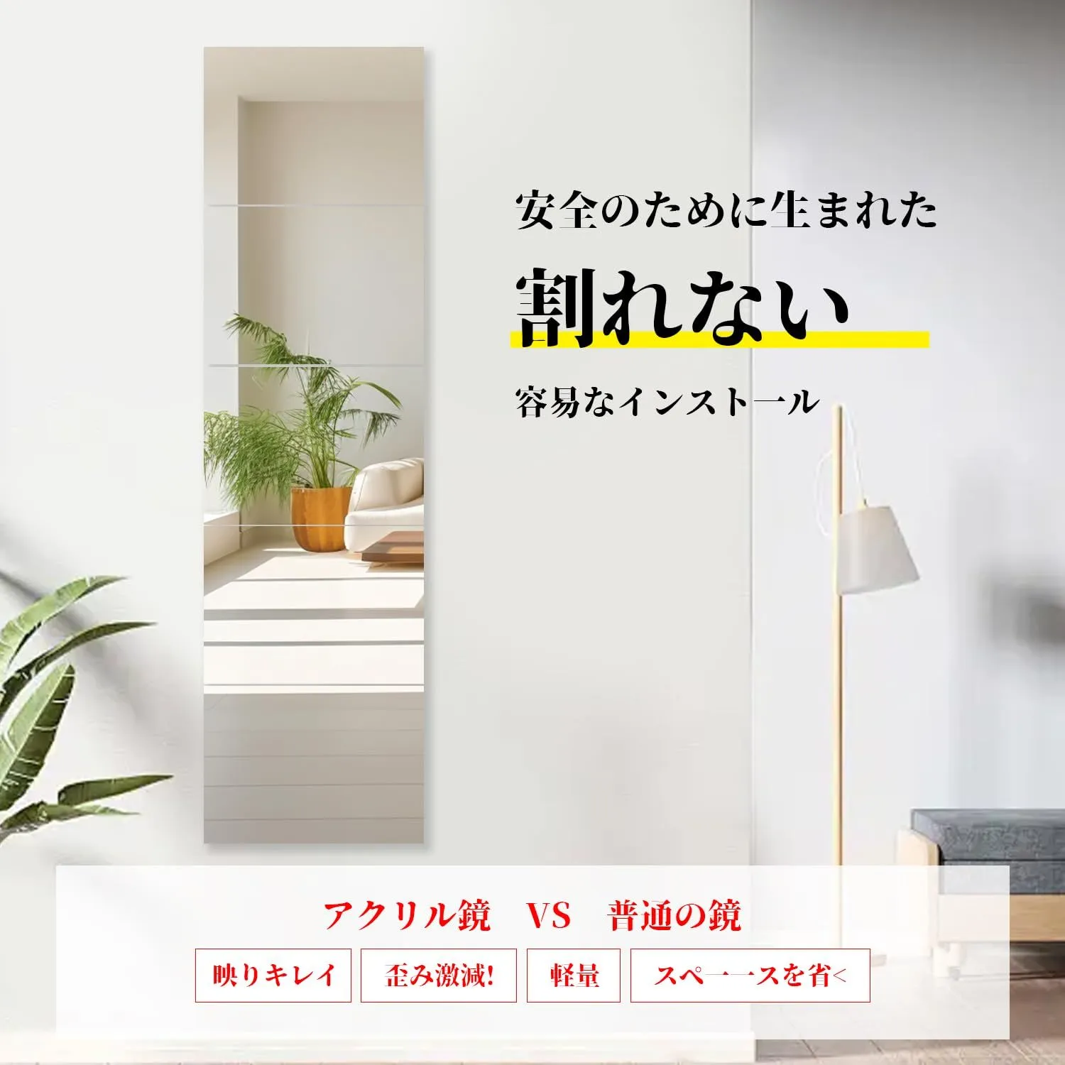 【こだわりの歪み軽減製法&梱包方法のアップグレード】歪みの軽減にこだわり日々改善に取り組んでいます現在は教育施設やスポーツ施設でも当製品をご利用いただいておりますアクリル素材のため、歪みが完全にない訳では御座いません梱包方法のアップグレード、コーナープロテクターを装着し、ポリ袋に入れる輸送中のアクリルミラーの破損を減らし、顧客の受取体験を向上させます