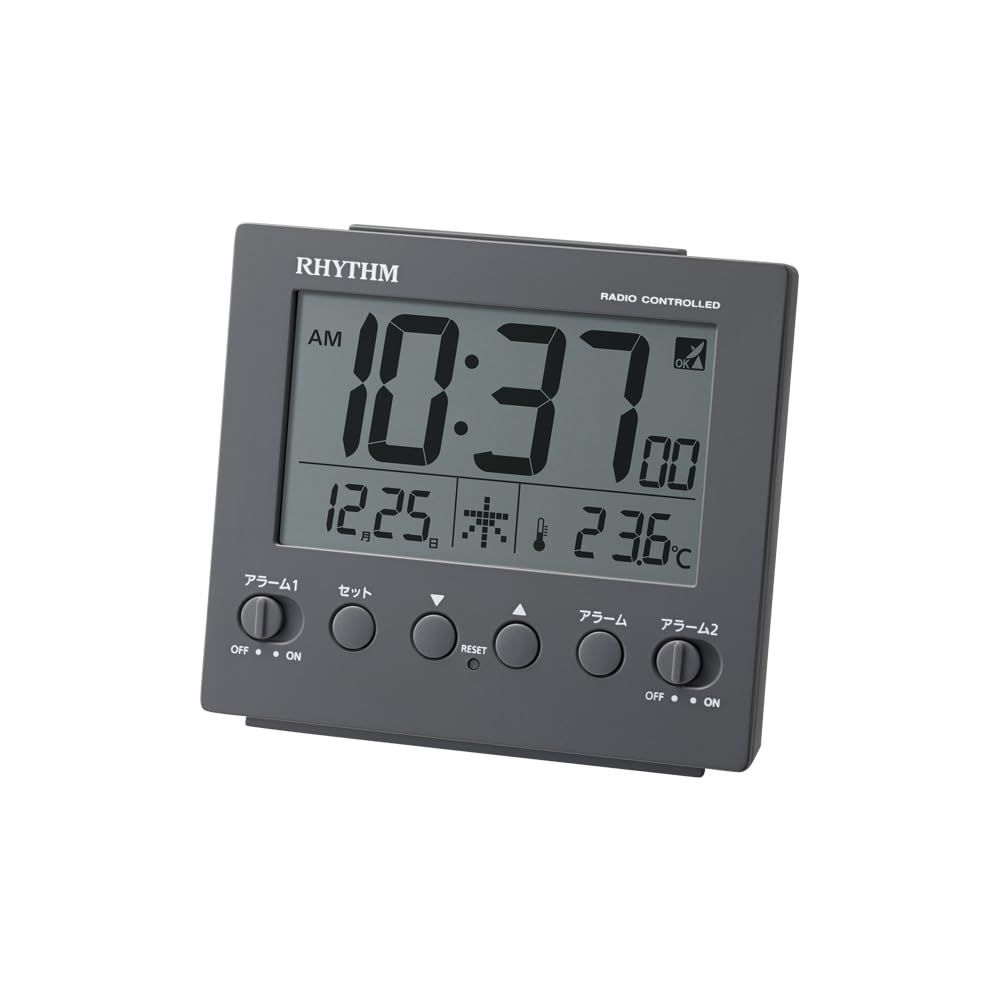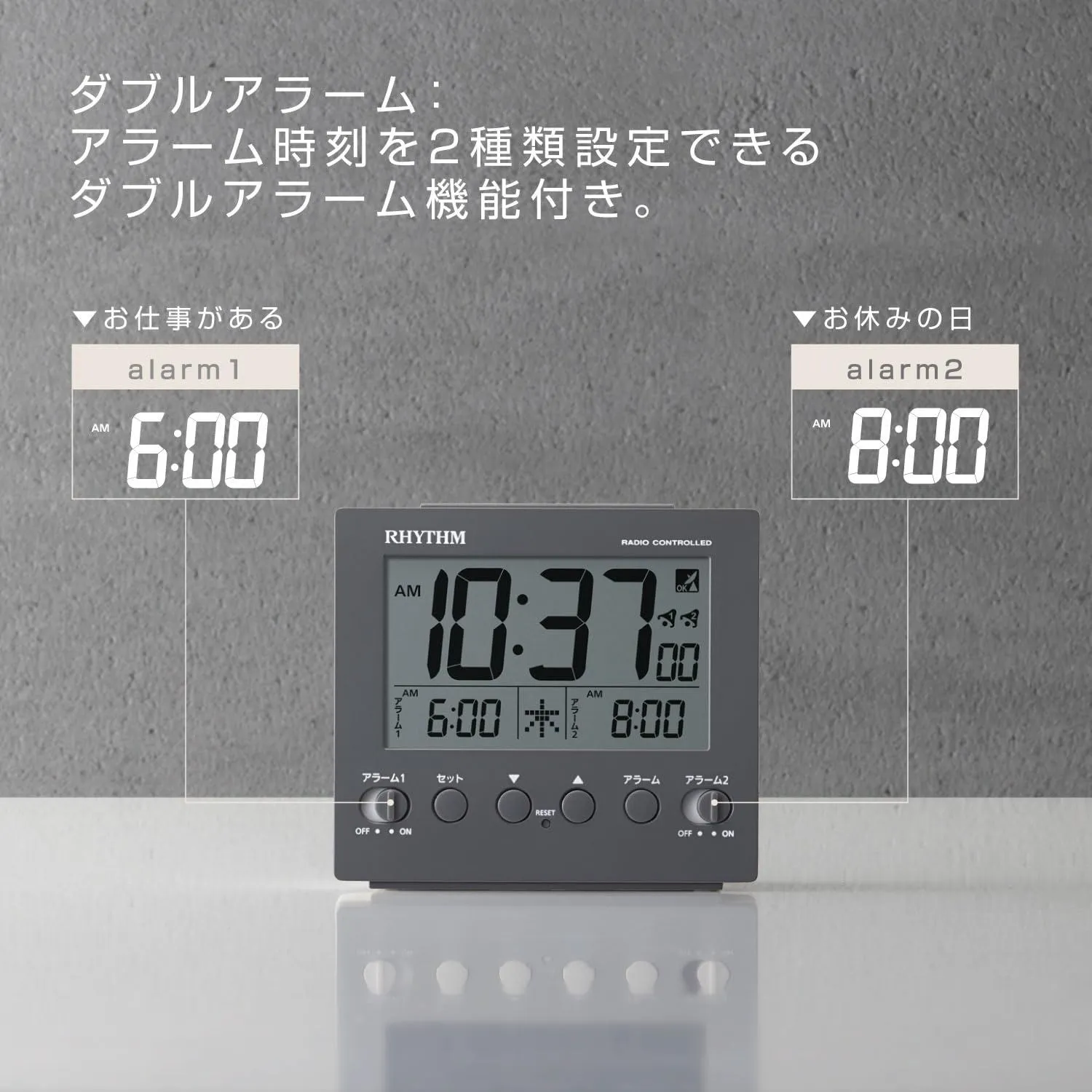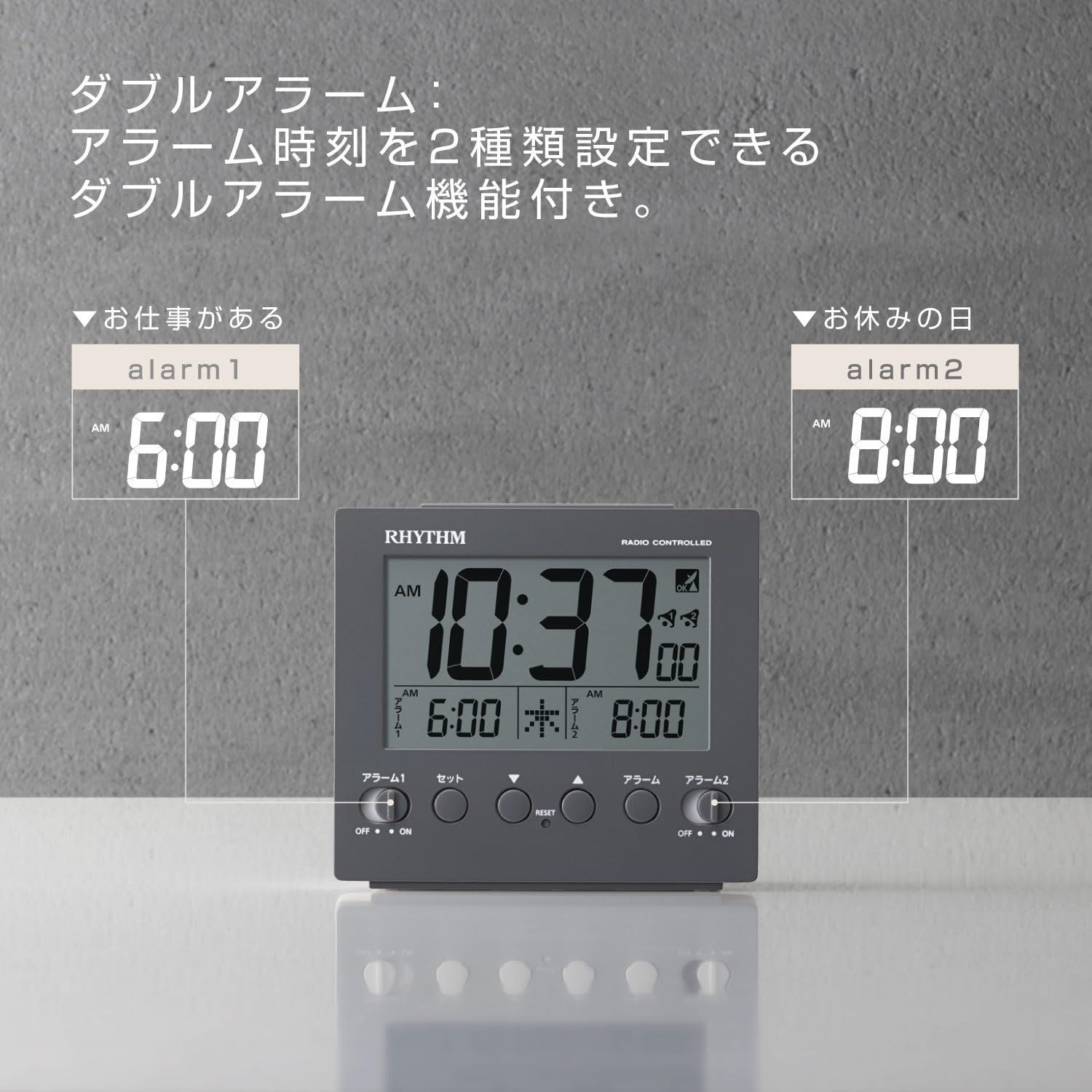 (スヌーズ アラーム 付) ダブル 温度計 ライト 電子音 カレンダー デジタル ダークグレー 電波時計 9.1×10×4.5cm フィットウェーブ 目覚まし時計 D236 リズム(RHYTHM) 8RZ236SR82