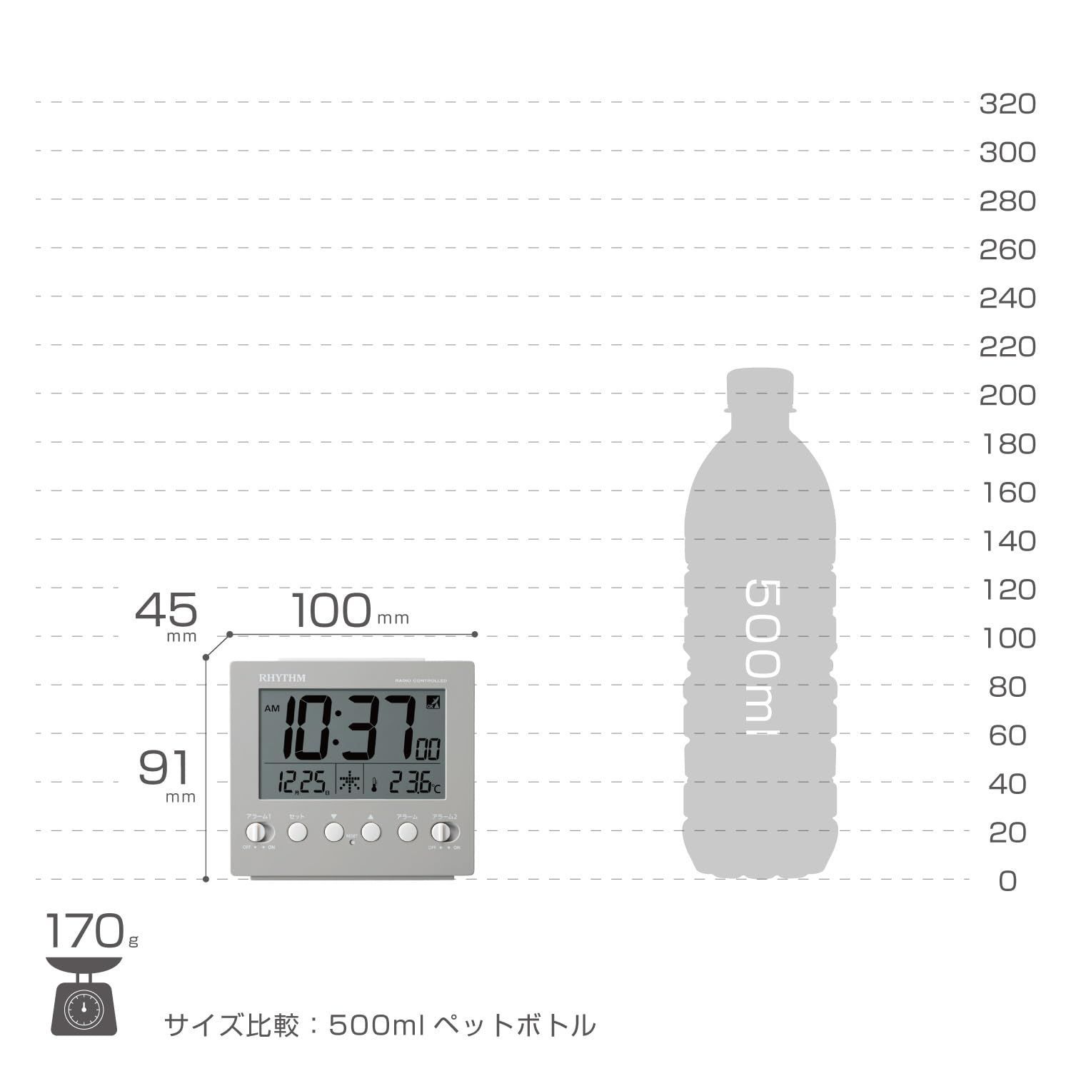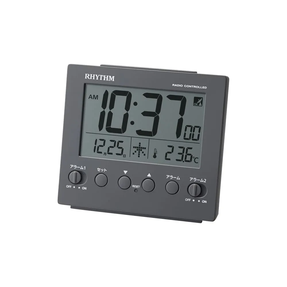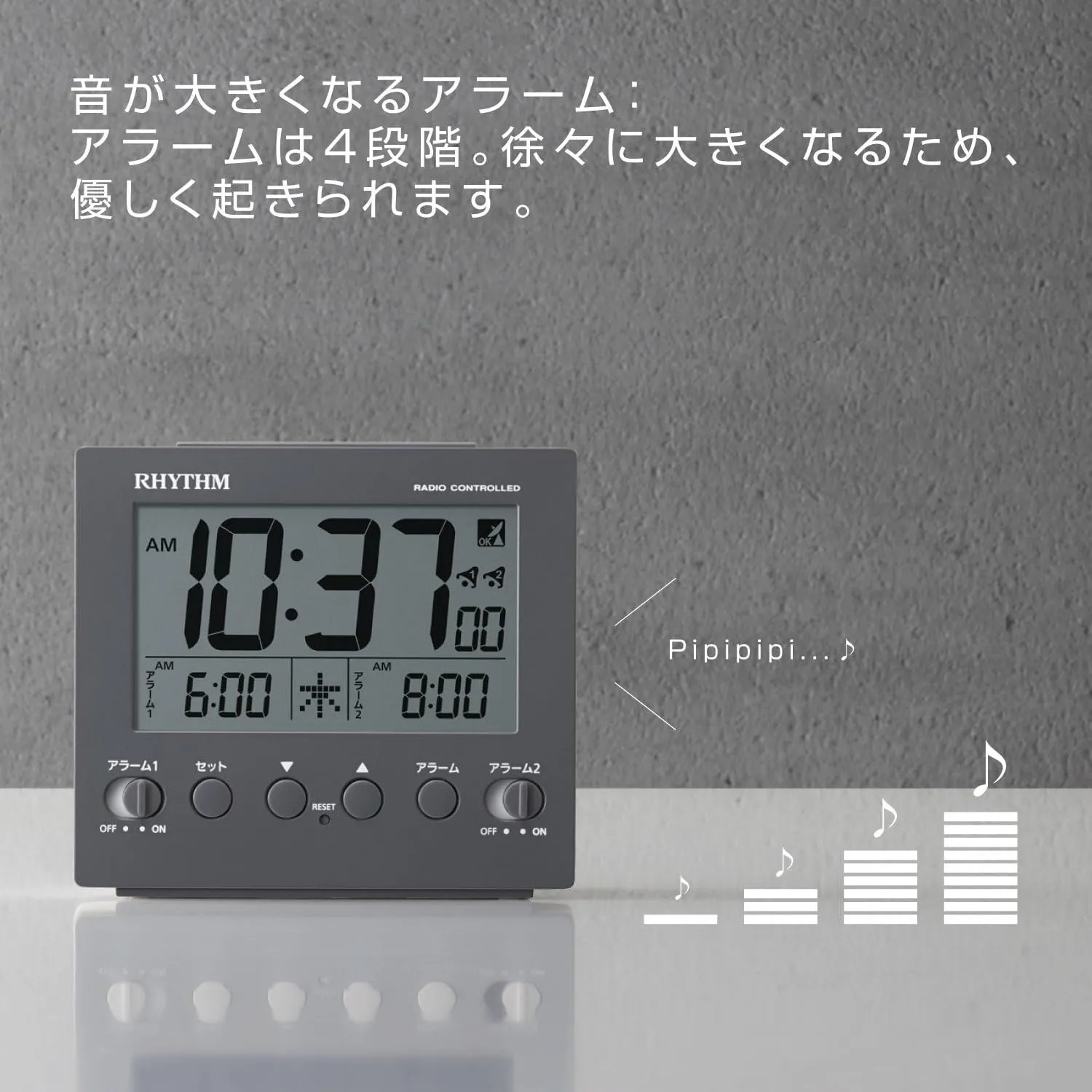 (スヌーズ アラーム 付) ダブル 温度計 ライト 電子音 カレンダー デジタル ダークグレー 電波時計 9.1×10×4.5cm フィットウェーブ 目覚まし時計 D236 リズム(RHYTHM) 8RZ236SR82