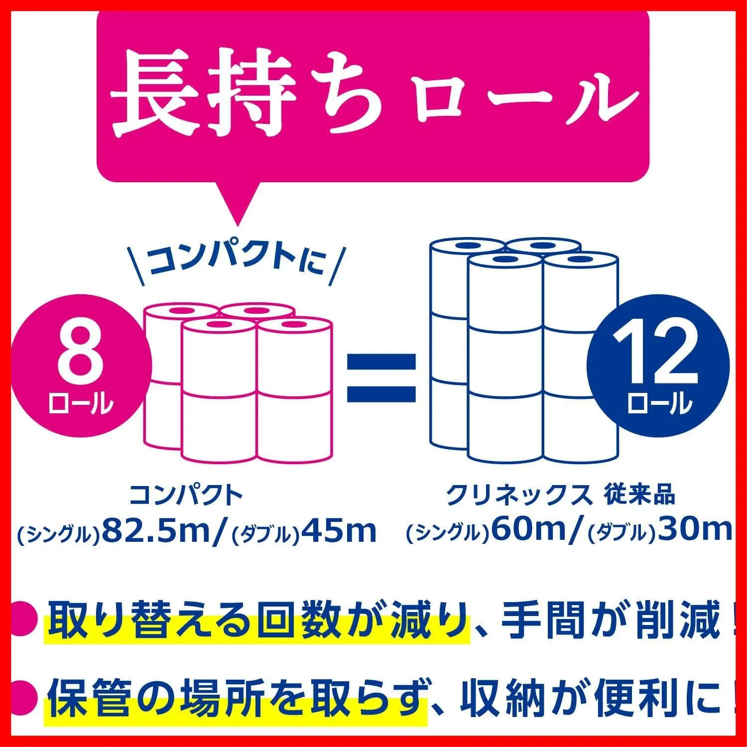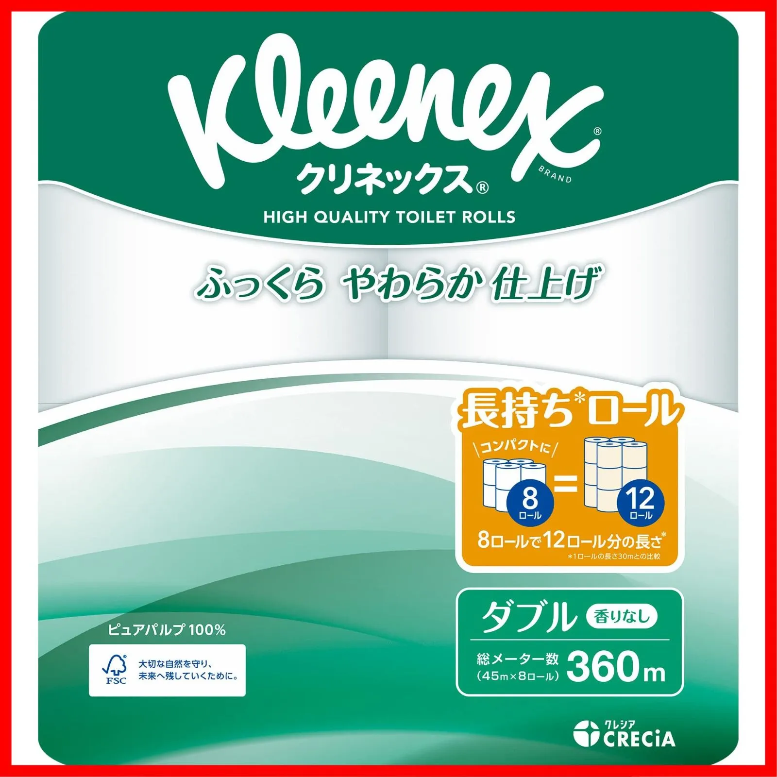 【 注 意 点 】 ・ フ ォ ロ ー頂 かないと確認が取れませんのでお手数お掛けしますが、ボ タ ン一つだけ ポ チ ッ とお願いいたします( * *) ━━━━━━━━━━━ トイレット ダブル 1.5倍長持ち 45m 64ロール クリネックス (ケース品) 長巻きタイプのトイレットロール ふっくらやわらかなクリネックスの長持ちトイレットロール。45mダブル×8ロール。省スペースで保管もスッキリ。たっぷり使えて取り替えの手間が軽減。きめ細やかなソフトタッチエンボス加工で、ふっくらふんわりとした拭きごこち。ピュアパルプ100%。無香料タイプ。外装フィルムはバイオマスインキ使用で環境にも対応しています。 ━━━━━━━━━