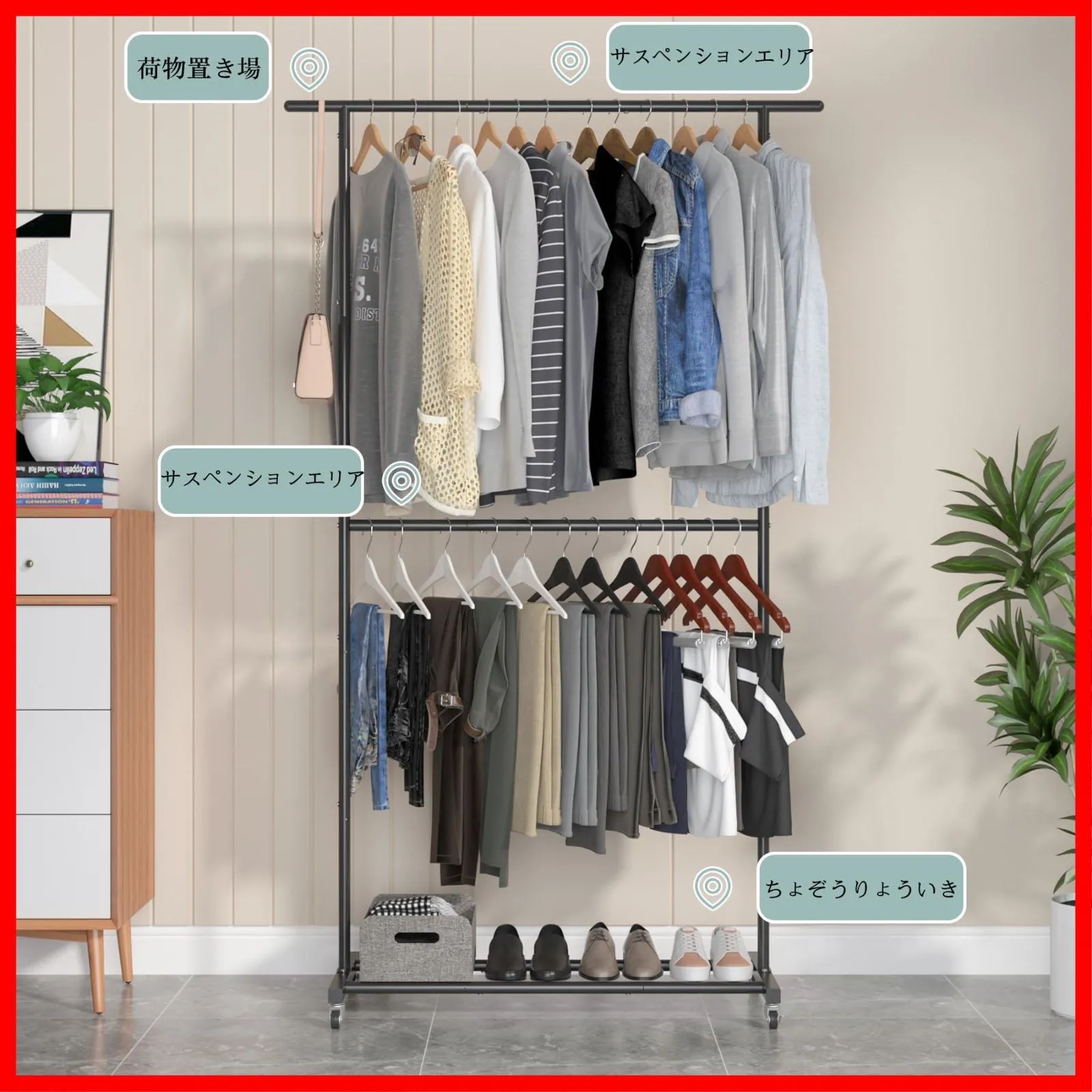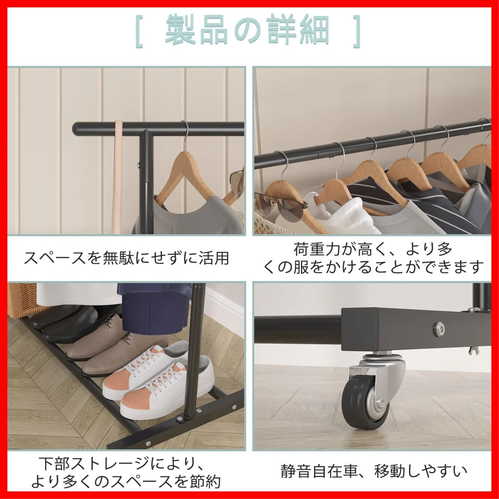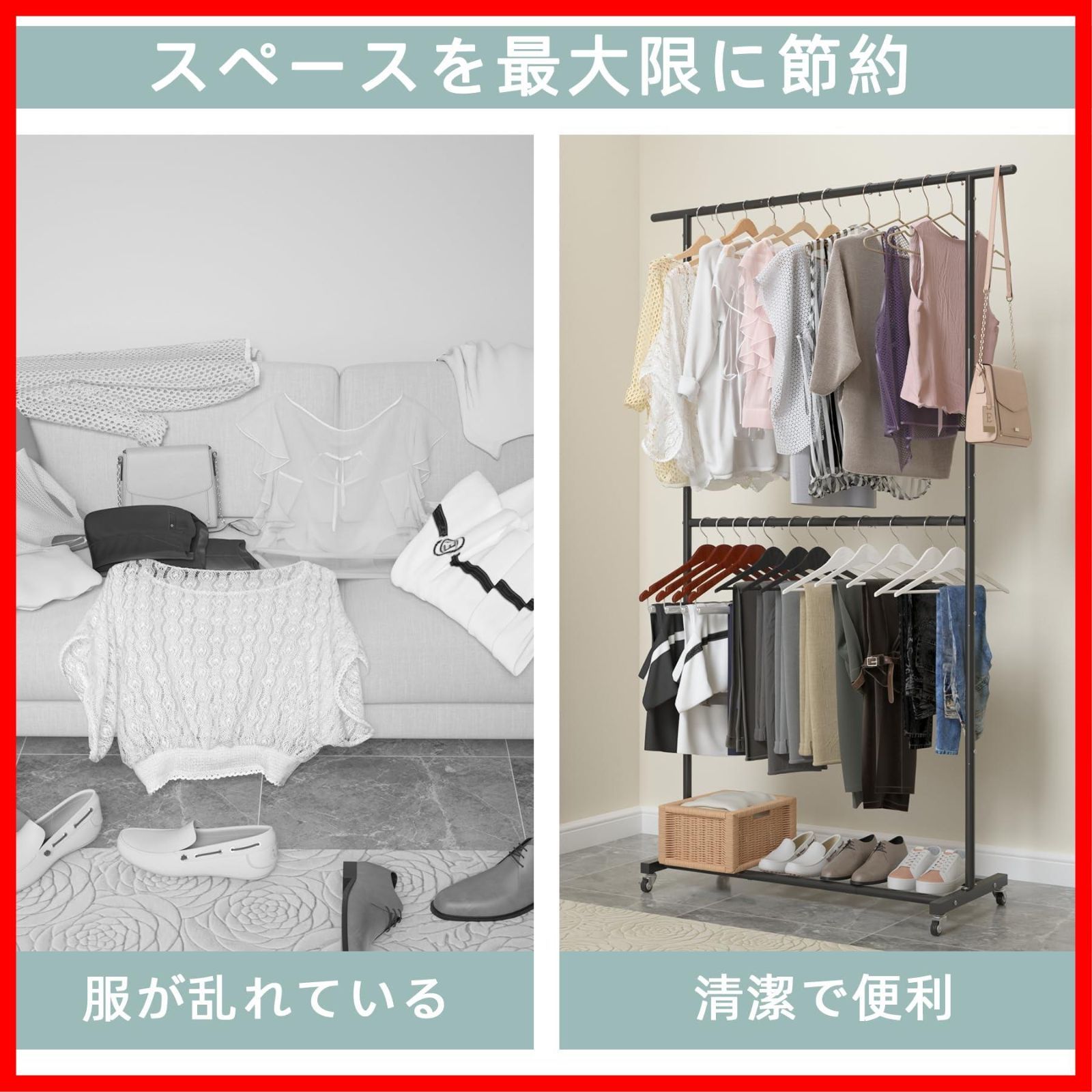 【自由に移動可能】-柔軟な動きのための4つの360°ホイール。持ち運びに便利な軽量ラック。あなたはそれをどこにでも移動することができ、あなたの服を整理するのが大好きです。