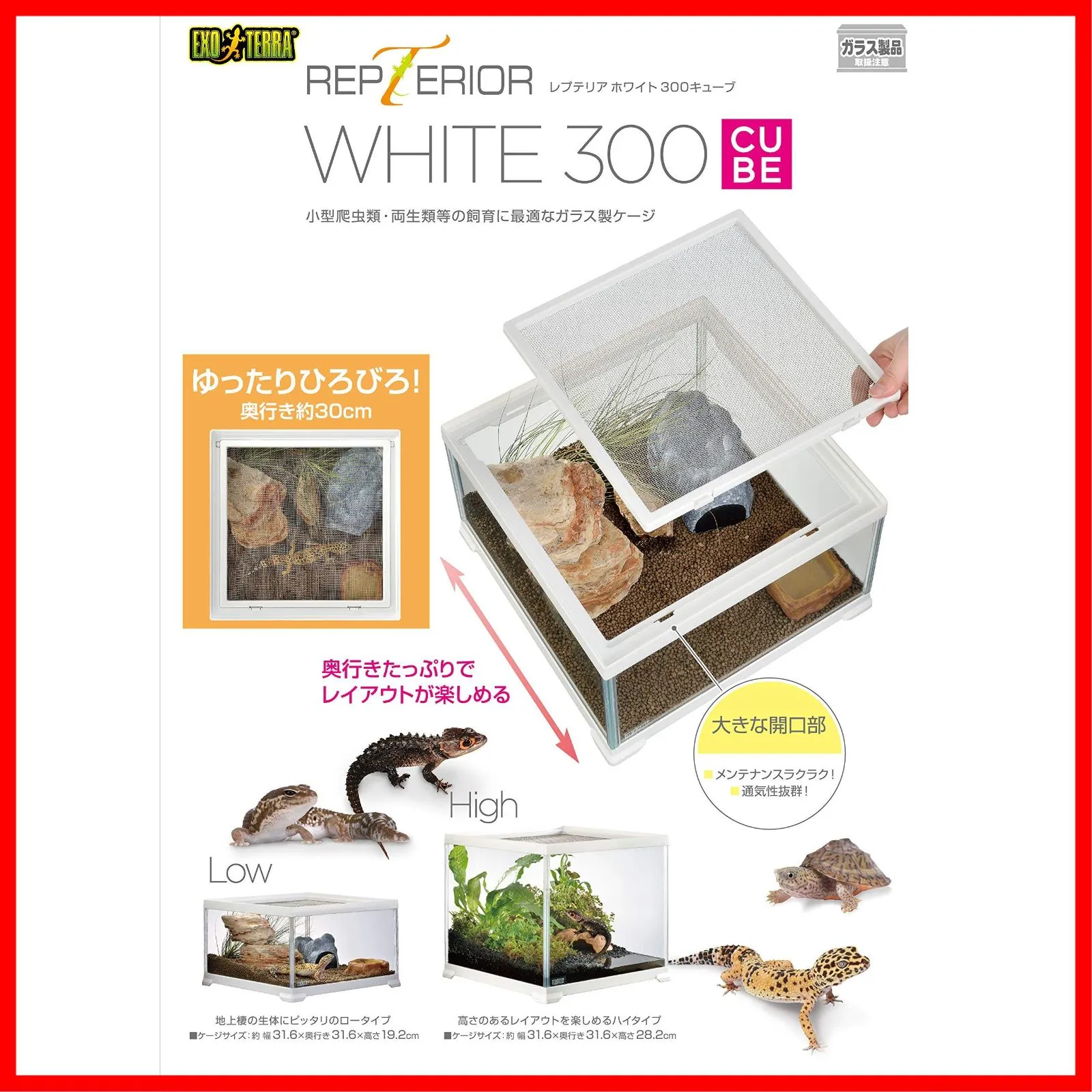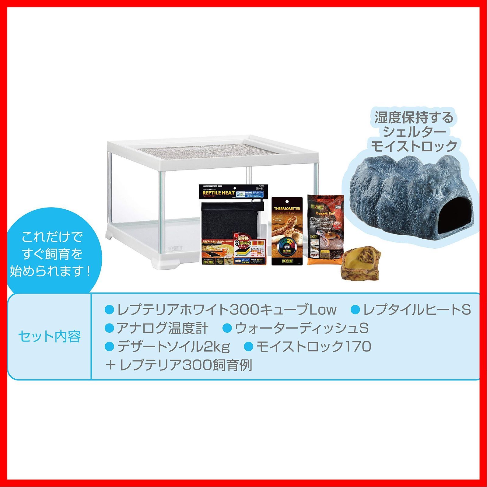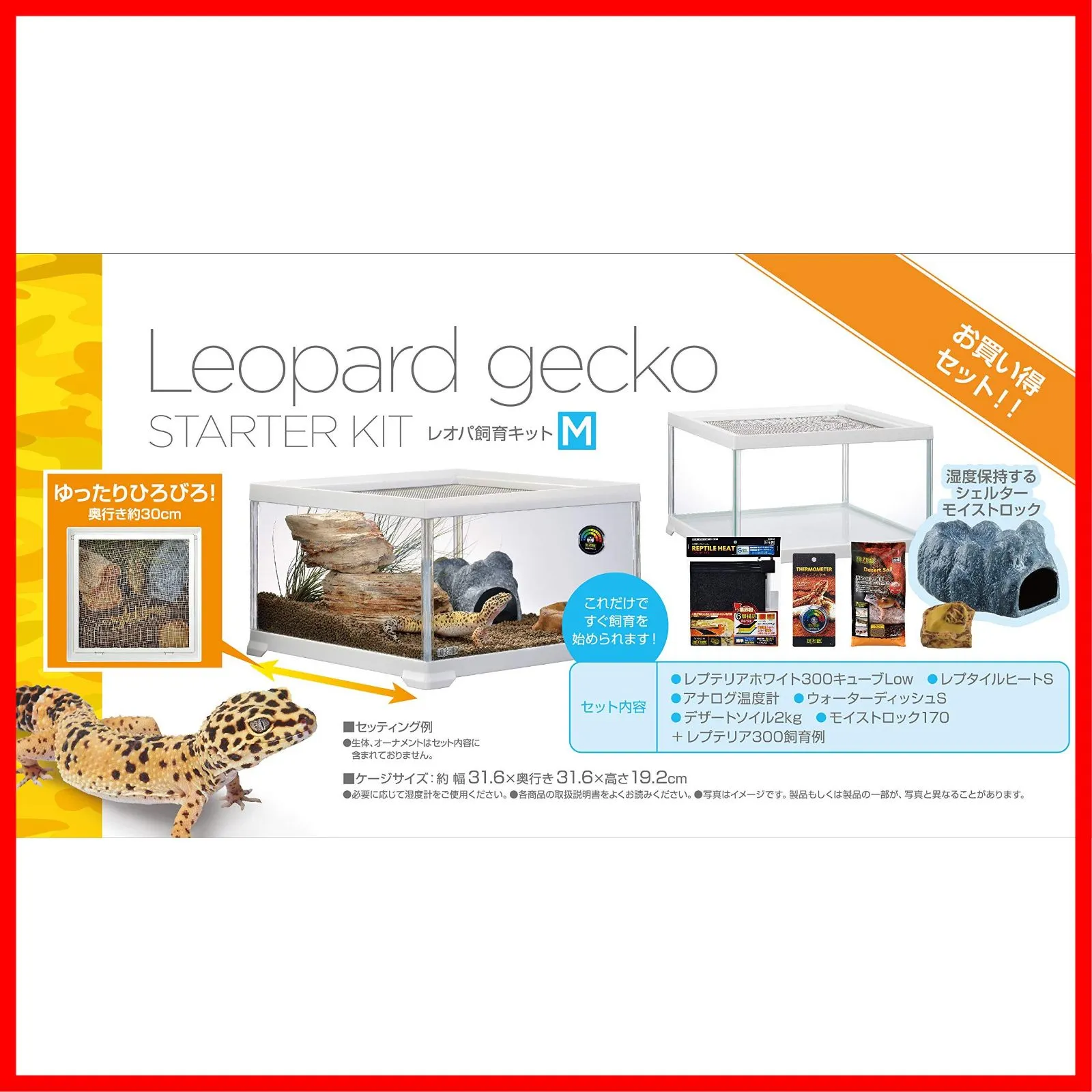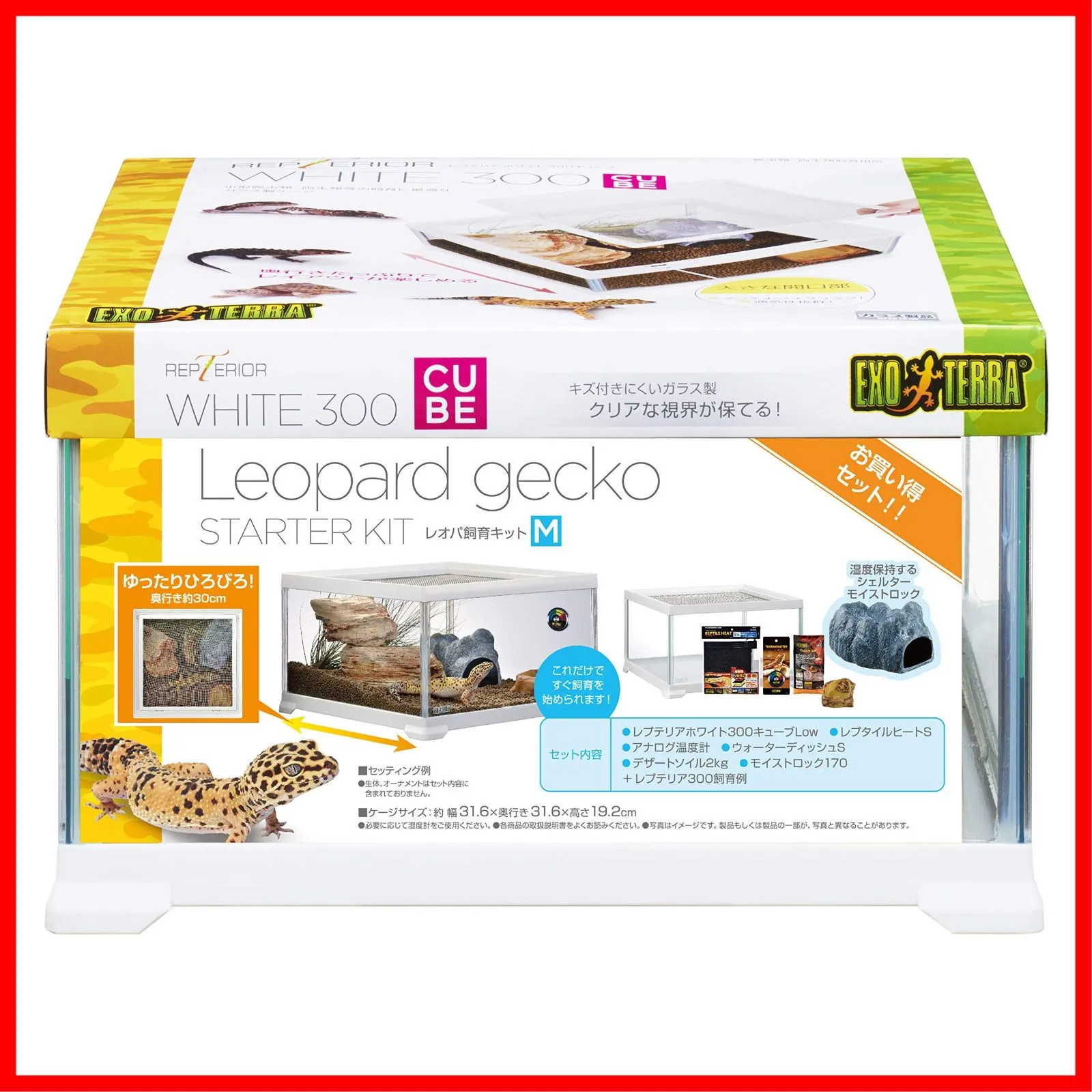 【 注 意 点 】 ・ フ ォ ロ ー頂 かないと確認が取れませんのでお手数お掛けしますが、ボ タ ン一つだけ ポ チ ッ とお願いいたします( * ?? ?*) ━━━━━━━━━━━ GEX EXOTERRA レプテリア レオパ飼育キットM 爬虫類用ガラスケージ 6点スターターセット ヒーター付 W31.6×D31.6×H19.2cm 本体重量:3.4kg 本体サイズ (幅X奥行X高さ) :31.6×31.6×19.2cm 原産国:インドネシア 商品モデル番号: 61993 ヒョウモントカゲモドキの飼育がすぐはじめられる、ゆったり広々サイズのスターターキット! ヒョウモントカゲモドキの飼育に最適な用品をセットしました。 消臭力抜群のソイルをセット!湿度保持するシェルターモイストロックもセットされているので、自然なレイアウトが簡単に作れます。 キズ付きにくいガラス製でクリアな視界が保てるレプテリアホワイト300キューブLowはインテリアに合うホワイトフレーム、地上棲の爬虫類・両生類にぴったりのロータイプ。奥行きたっぷりでレイアウトが楽しめる! 大きな開口部(着脱式メッシュカバー)でメンテナンスラクラク、通気性も抜群。 ケージサイズ:約幅31.6×奥行き31.6×高さ19.2cm セット内容:レプテリアホワイト300キューブLow、レプタイルヒートS、アナログ温度計、ウォーターディッシュS、デザートソイル2kg、モイストロック170、レプテリア300飼育例 使用上の注意