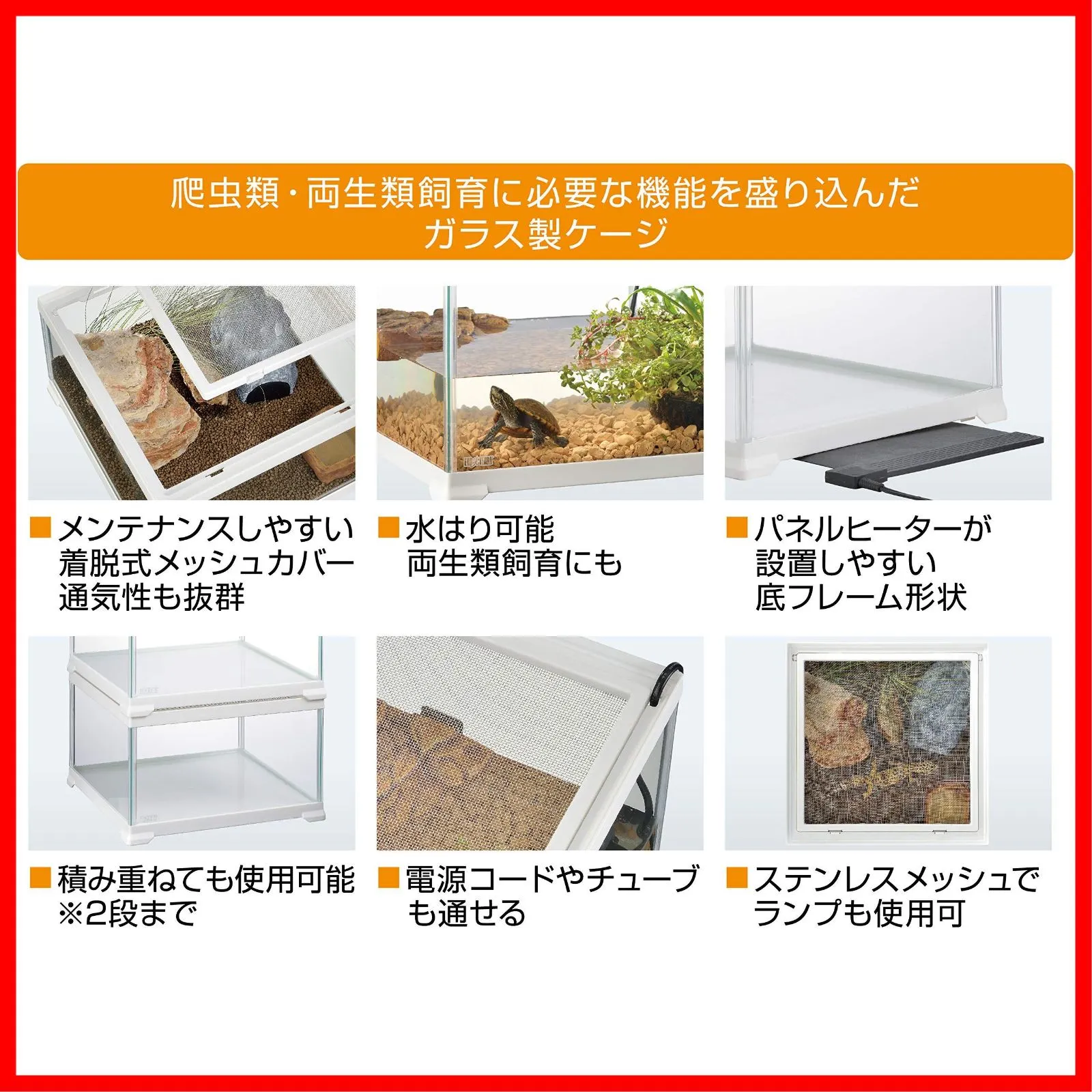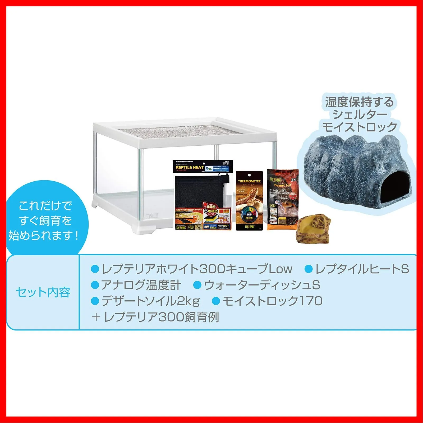 ●ランプはケージ内では使用しないでください。 原材料・成分 ケージ:ガラス、PS、ステンレス/ヒーター:PTC発熱体、PET、PP/温度計:PS他/水飲み皿:ポリレジン/シェルター:陶土/ソイル:天然赤土 使用方法 小型の爬虫類・両生類・昆虫等の飼育用ケージとしてお使いください。※セット方法については各製品の取扱説明書をご確認ください。 ご注意(免責)>必ずお読みください ※製品の仕様、デザイン、価格等予告なく変更することがあります。 ━━━━━━━━━