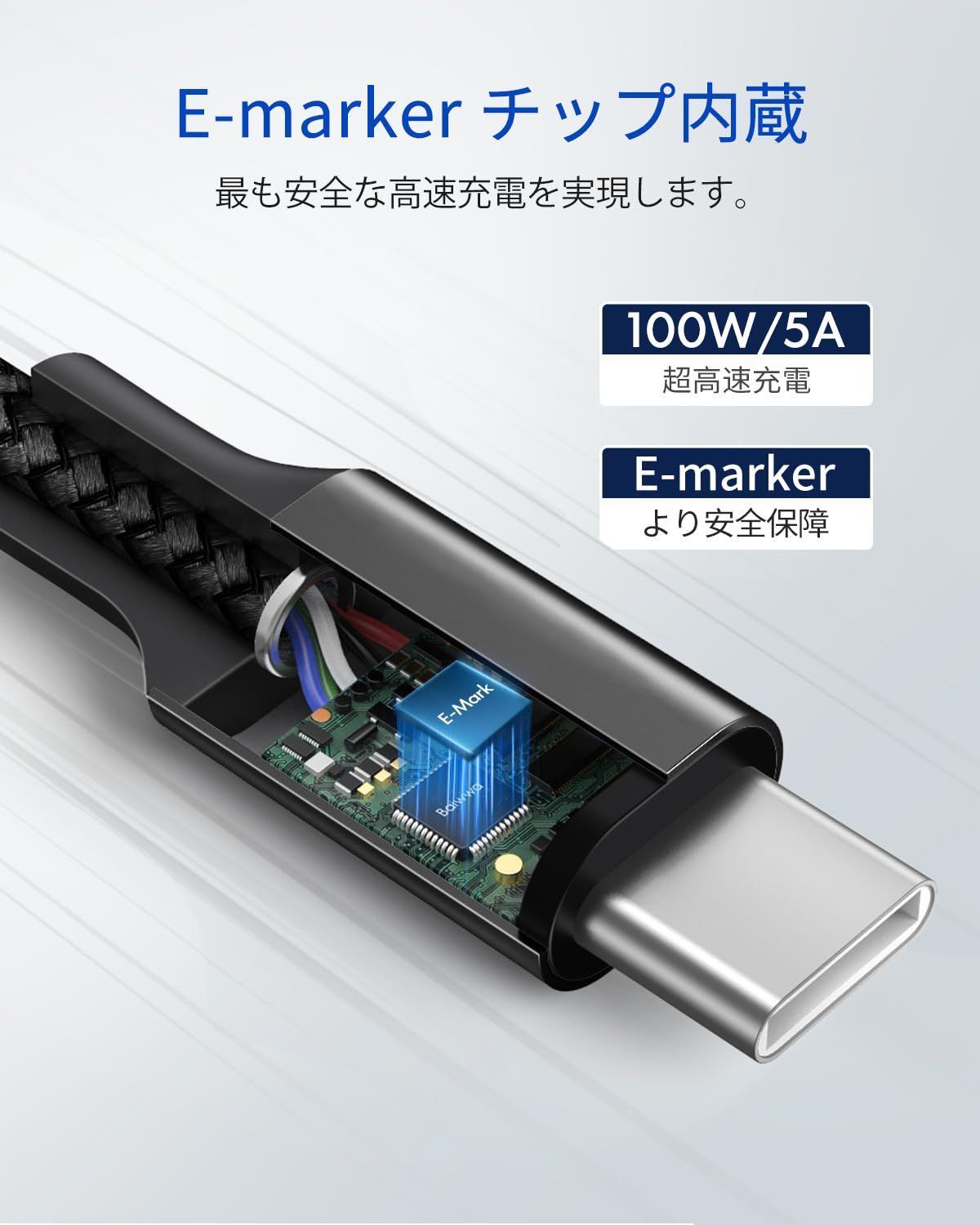 ◆高い信頼で安全性 USBケーブルの両端子に内蔵されたeMarkerチップにより、最大100Wの給電にも耐えうる高い安全性を実現しました。
