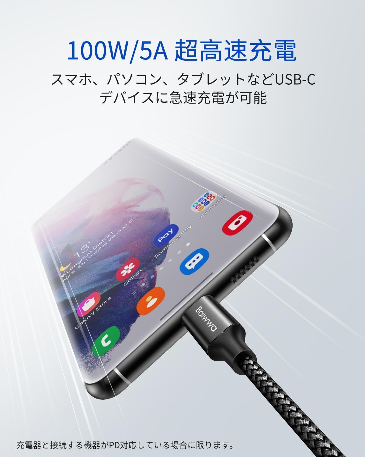 【100W高速充電】このUSB CtoC ケーブルはUSB PD技術に対応し、最大100W/5Aの高出力で安定して高速充電を実現できます。100W 87W 65W 61W 45W 30W 18Wの電力供給PD急速充電をサポートします。