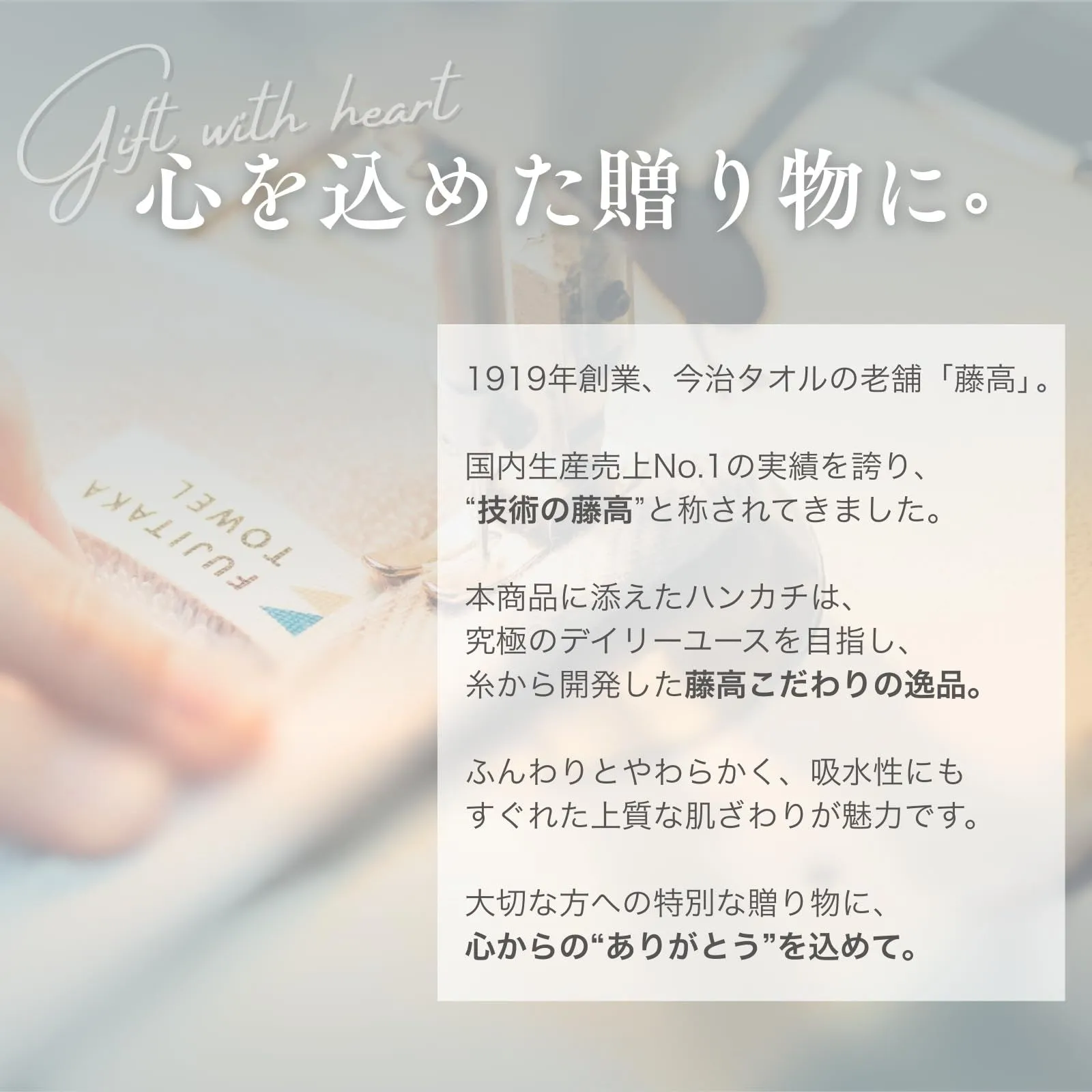 【贈る理由になるハンカチ】 プレゼント選びの決め手は、「自分でも欲しい」と思えるかどうか。 創業100年を超える今治の老舗・藤高タオルと共同開発したこのハンカチには、その理由があります。 タオル専用の糸が生み出すやわらかさ、上品なシンプルカラー。何度洗ってもふんわり感が続く、ていねいな仕立て。“選んだ理由”が、ちゃんと伝わるハンカチです。