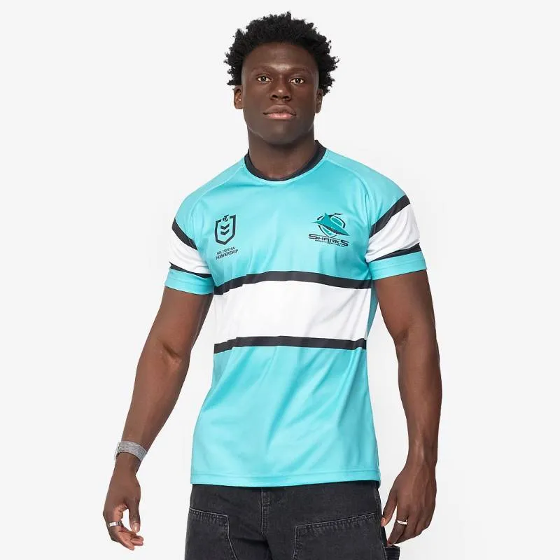 チームカラーのブルーを基調に、左胸には象徴的なシャークスのエンブレム、右胸には高品質の証である「NRL Telstra Premiership」の公式ロゴが配されています。