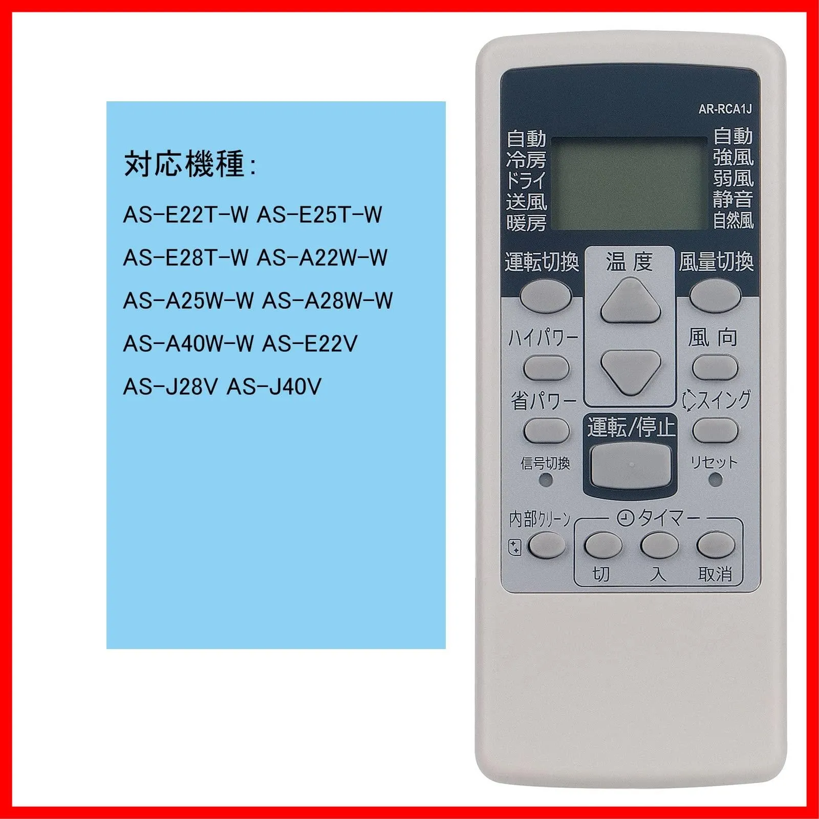 【 注 意 点 】 ・ フ ォ ロ ー頂 かないと確認が取れませんのでお手数お掛けしますが、ボ タ ン一つだけ ポ チ ッ とお願いいたします( * ?? ?*) ━━━━━━━━━━━ WINFLIKE 代替リモコン fit for 富士通 AR-RCA1J(ダイヨウ) エアコン用 設定不要 すぐに使える AS-E22T-W AS-E25T-W AS-E28T-W AS-A22W-W AS-A25W-W AS-A28W-W AS-A40W-W AS-E22V AS-J28V AS-J40V ?販売されている商品は AR-RCA1Jの代替リモコンでございます。?オリジナルリモコンに付いている全てのボダンが設置され、オリジナルリモコンと同等の機能性とデザイン性を備えております。 ?複雑な設定の必要がなく電池を入れるとすぐに使えるリモコンです。 ?使用の電池:単4×2本(別売り)(アルカリ乾電池をご使用ください。) ?対応機種:AS-E22T-W AS-E25T-W AS-E28T-W AS-A22W-W AS-A25W-W AS-A28W-W AS-A40W-W AS-E22V AS-J28V AS-J40V ?期間:ご購入後1年間の期間を設定しており、万が一、商品に不具合などがございましたら、お気軽に弊店までご連絡ください。(メールで) 対応機種:AS-E22T-W AS-E25T-W AS-E28T-W AS-A22W-W AS-A25W-W AS-A28W-W AS-A40W-W AS-E22V AS-J28V AS-J40V ━━━━━━━━━