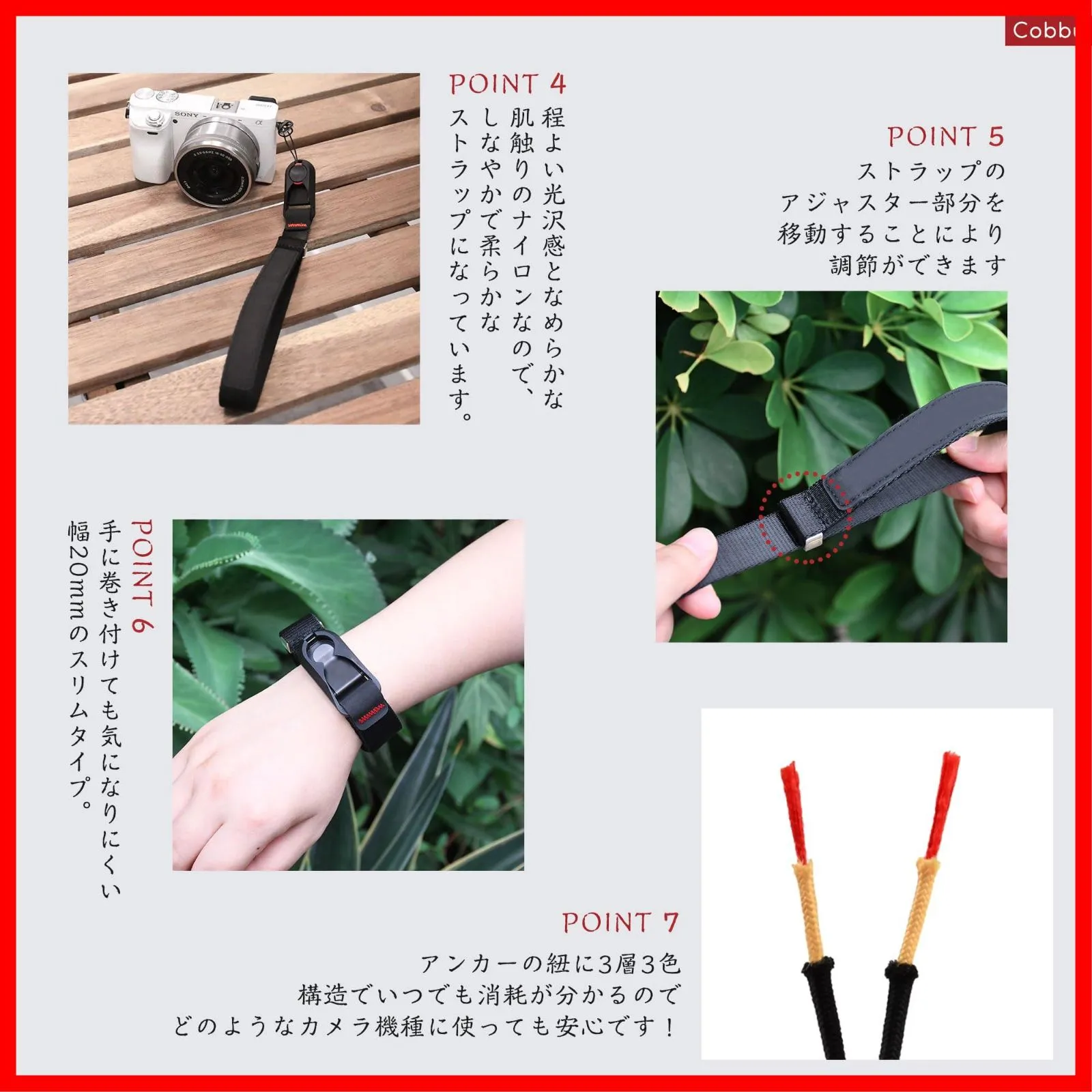 【対応カメラ】 円形・三角リングが付き、各型番の一眼レフ・ミラーレス・GOPROなどのために専門設計されたリストストラップです。 ━━━━━━━━━