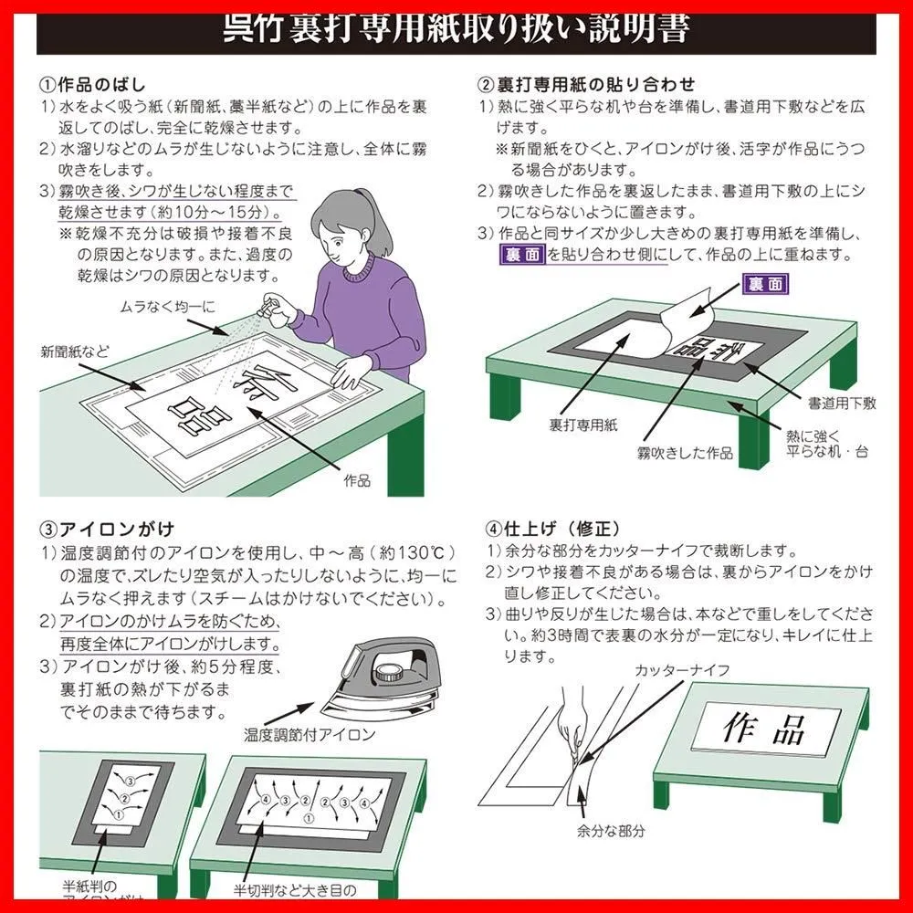 【 注 意 点 】 ・ フ ォ ロ ー頂 かないと確認が取れませんのでお手数お掛けしますが、ボ タ ン一つだけ ポ チ ッ とお願いいたします( * ?? ?*) ━━━━━━━━━━━ 呉竹 裏打用紙 裏打専用紙 半紙判 厚口 LA18-26 半紙判 厚口 10枚入り 半紙判 10枚入。 霧吹きとアイロンだけで裏打ちが綺麗にできる。 厚口タイプ(当社比)。 初めての方でも簡単、無駄なく確実に裏打ちができます。 急ぎの裏打ち作業にも便利です。 商品名:呉竹 裏打専用紙 半紙判 厚口 LA18-26 ━━━━━━━━━