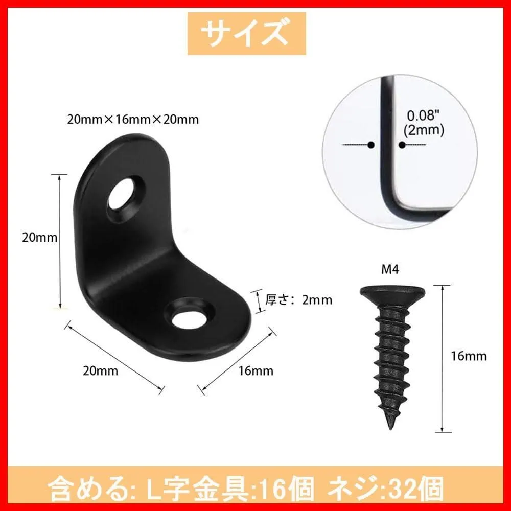 【 注 意 点 】 ・ フ ォ ロ ー頂 かないと確認が取れませんのでお手数お掛けしますが、ボ タ ン一つだけ ポ チ ッ とお願いいたします( * ?? ?*) ━━━━━━━━━━━ サムコス l字金具 ステンレス L字アングルブラケット 直角フック 16個 アングル ブラケット金具 転倒防止 補強 金具 ネジ 32個付 棚受け金具 (20*20*16mm) セット内容:l字アングル16個、専用ネジ32個。90度直角のデザインは、家具部分がしっかり固定されることができる重要なジッパーです。 サイズ:長さ20mm×幅16mm×高さ20mm。厚さ:2mm。ネジ・サイズ:M 4 * 16 mm。 材質:ステンレス鋼。頑丈な、防錆および長期耐久性,非常に良い。 ネジ付き:専用ネジがついておりますのですぐに作業いただけます。同じ質感のネジ付きなので、雰囲気を損ないません。 適用範囲:書籍ホルダーブラケット、デスクサポートブラケット、店舗、部屋、キッチン、浴室などの場所に適用し、壁置き台ブラケットとしてもできます。 l字アングル16個、専用ネジ64個。90度直角のデザインは、家具部分がしっかり固定されることができる重要なジッパーです。 ━━━━━━━━━