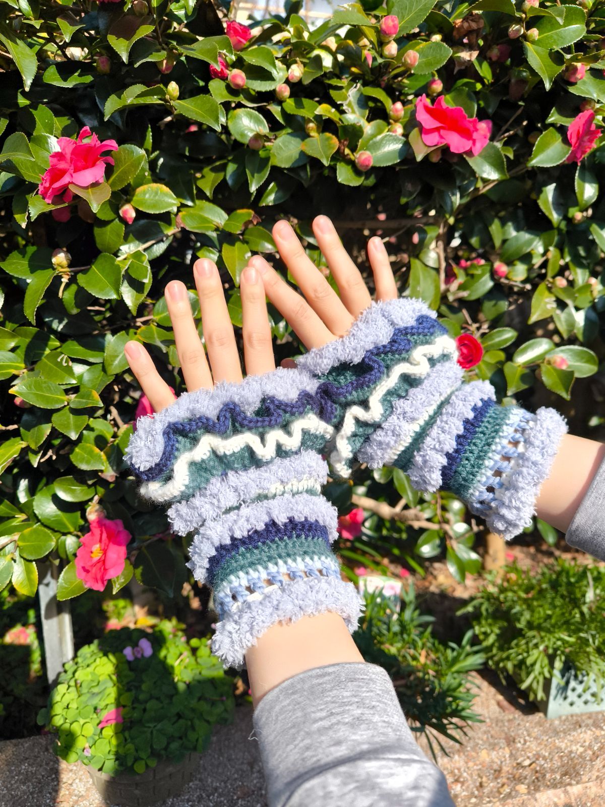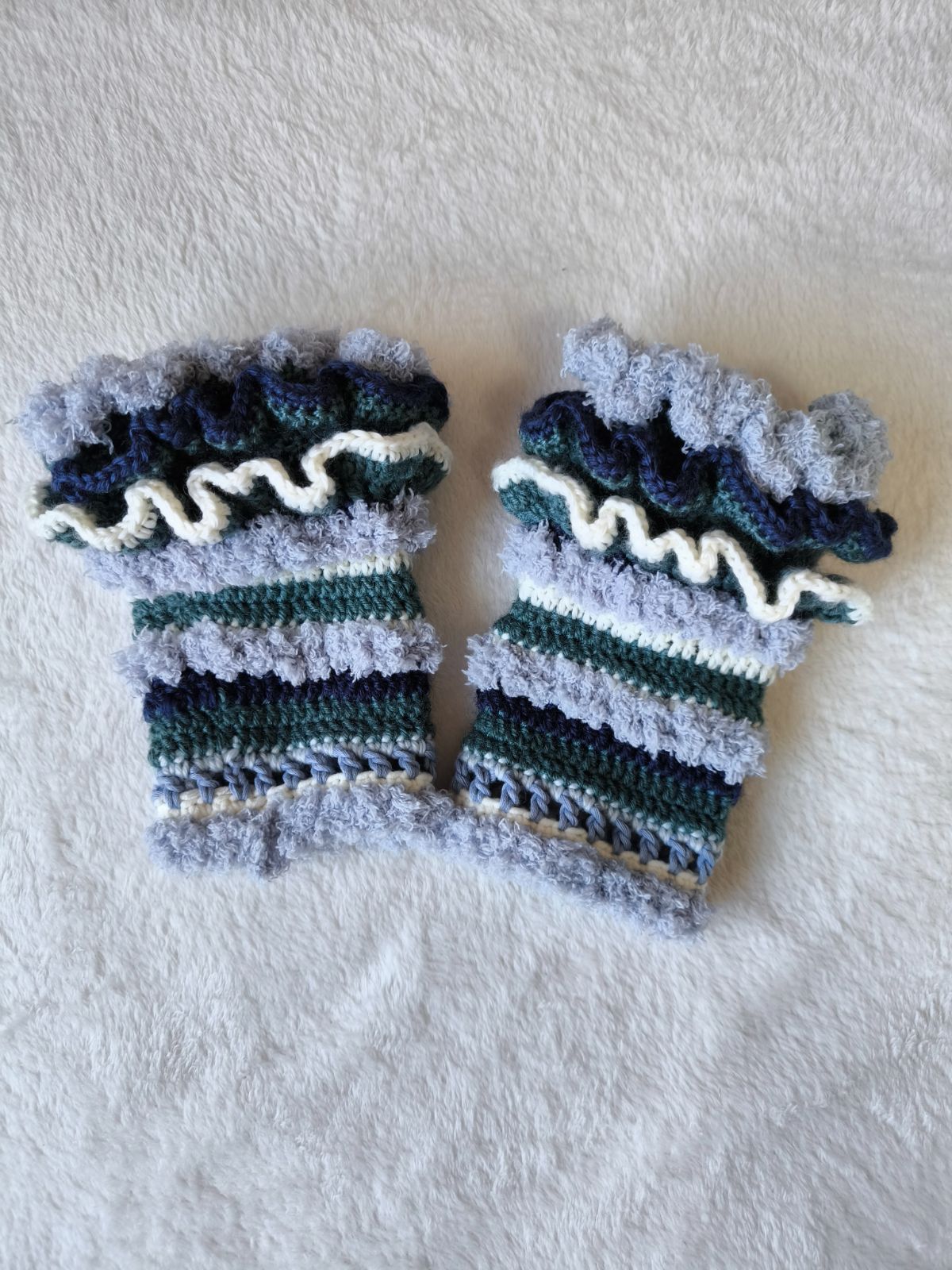【ハンドメイド】フリルたっぷり*ふわもこミックス糸のアームウォーマー(ブルーグレー系)