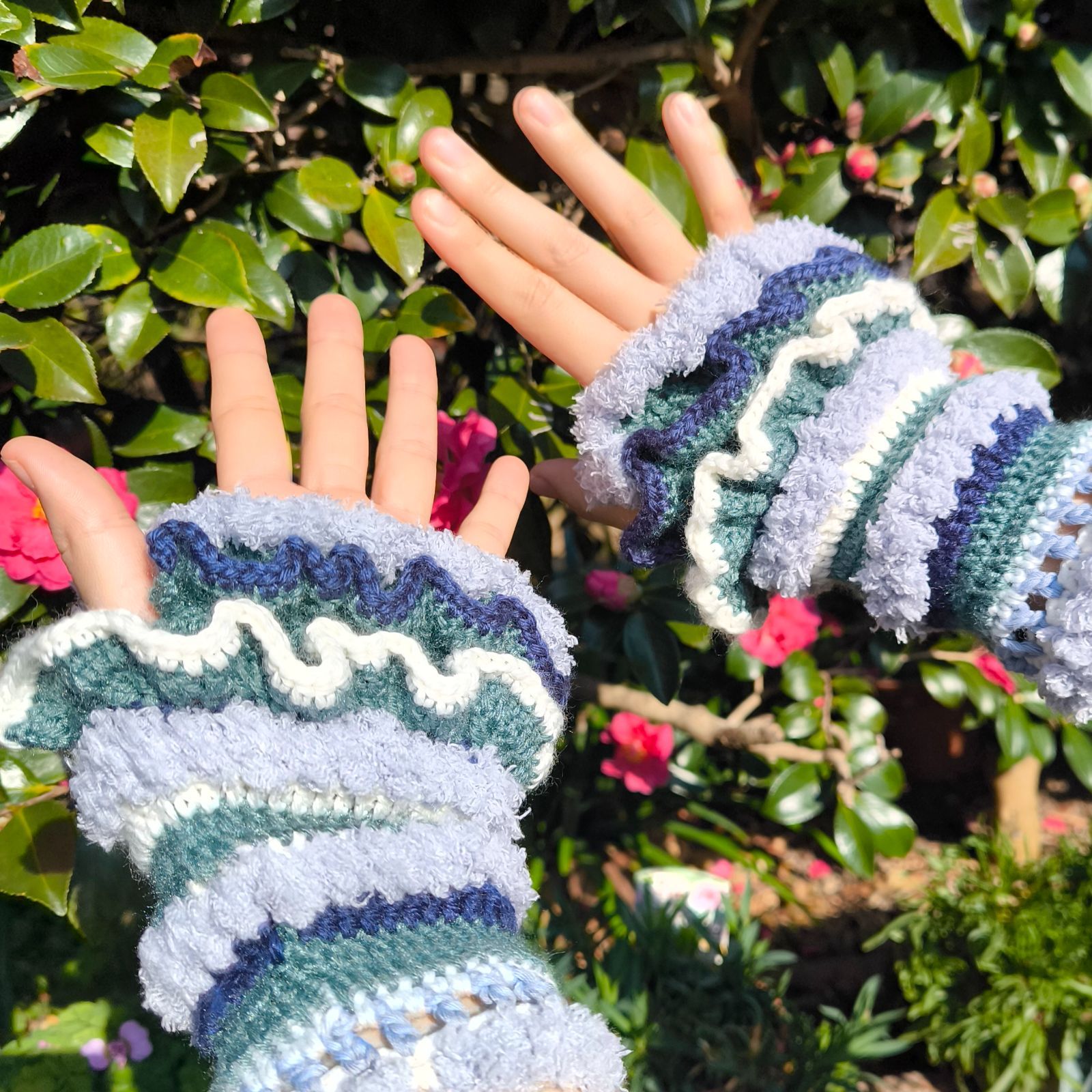 こちらのアームウォーマーは、複数の糸の質感とフリルが組み合わさった、非常にデコラティブで可愛らしいデザイン✨