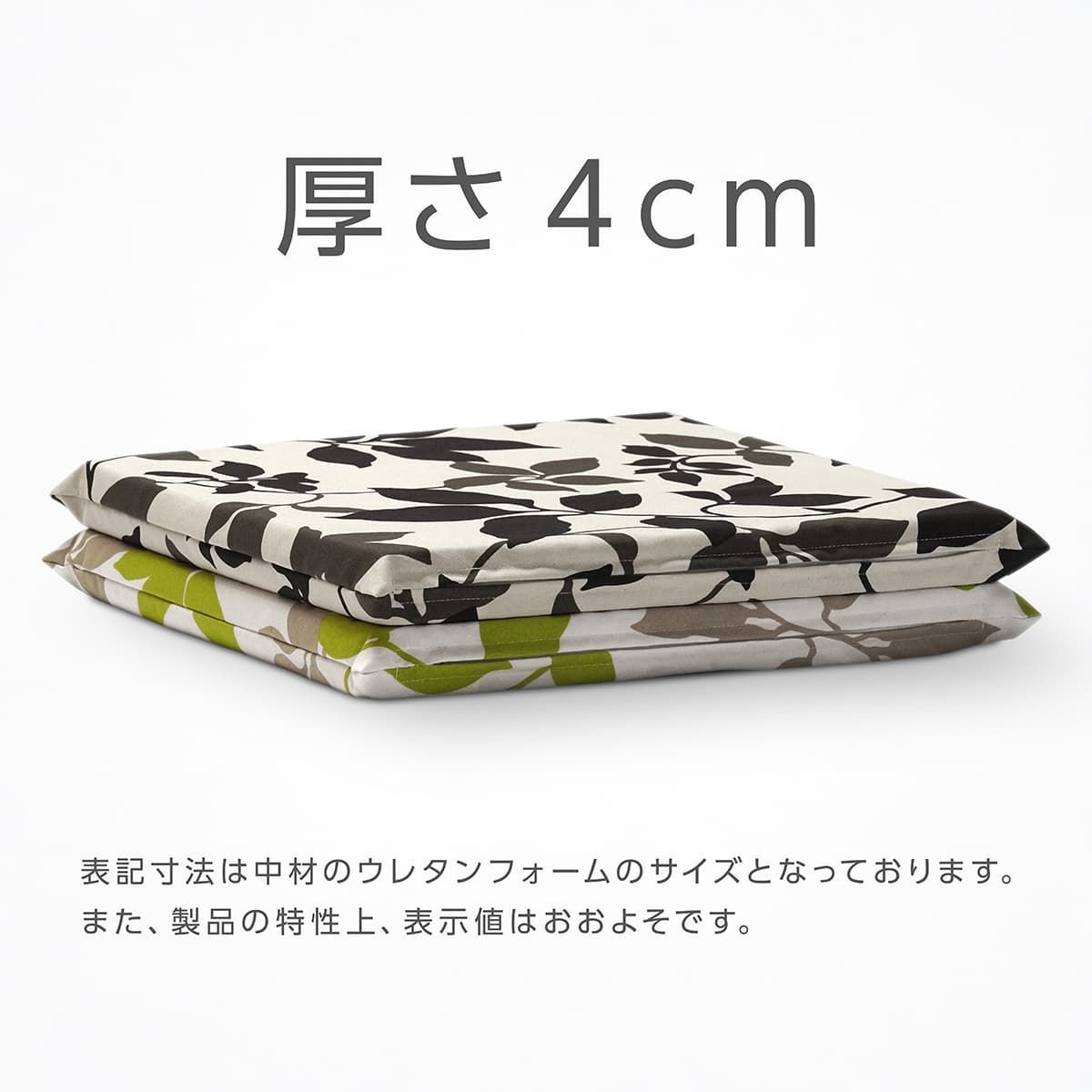 ■ 商品仕様 タイプ:シートクッション サイズ:幅41×奥行き41×厚み4cm(※2) 側地(カバー):綿100% 中材:ウレタンフォーム 機能:カバーのみ洗濯可能(※1) ※1 綿素材なので縮みに関してはお客様の自己責任にて管理願います。 ※2 製品の特性上、表示値はおおよそです。 ----------------------------------------