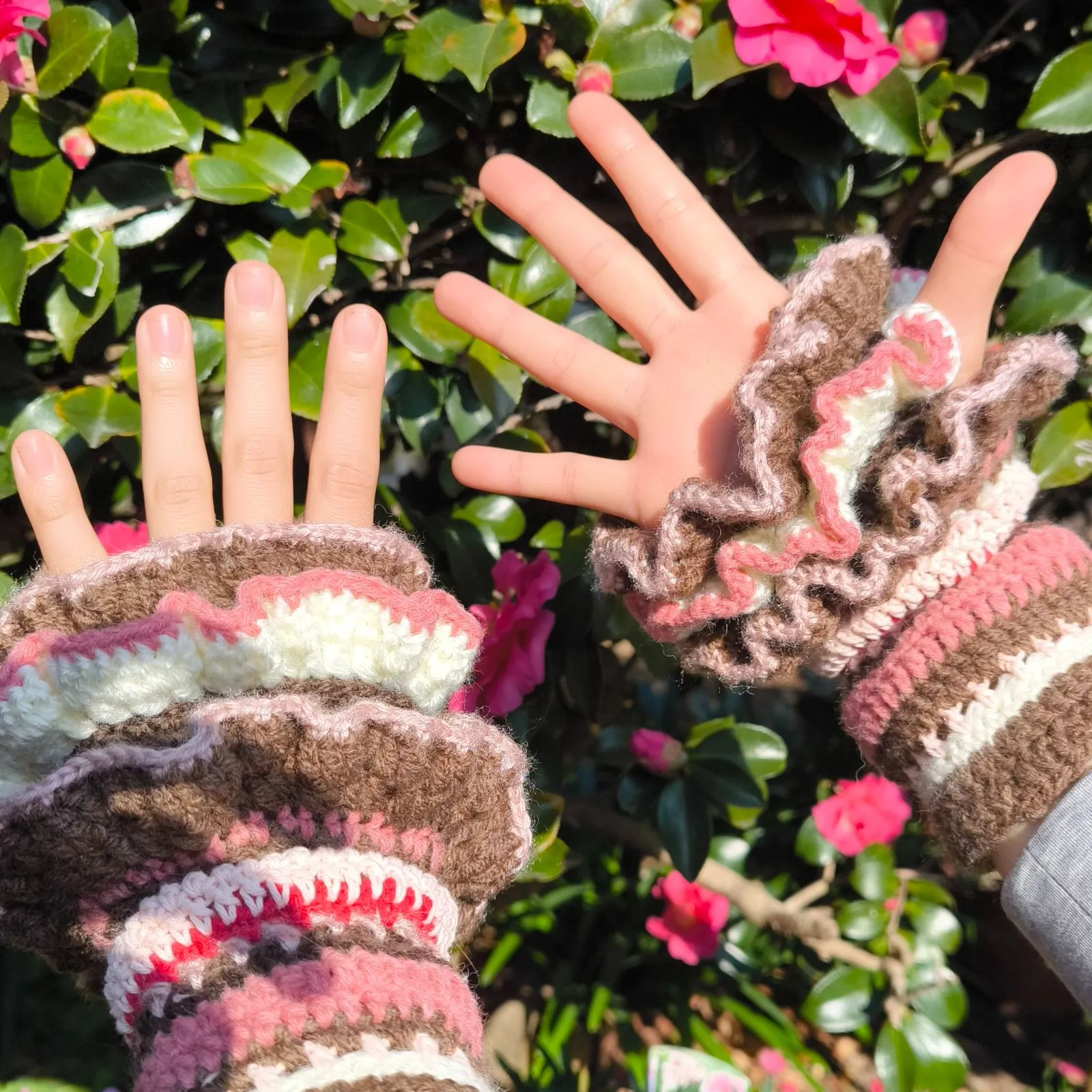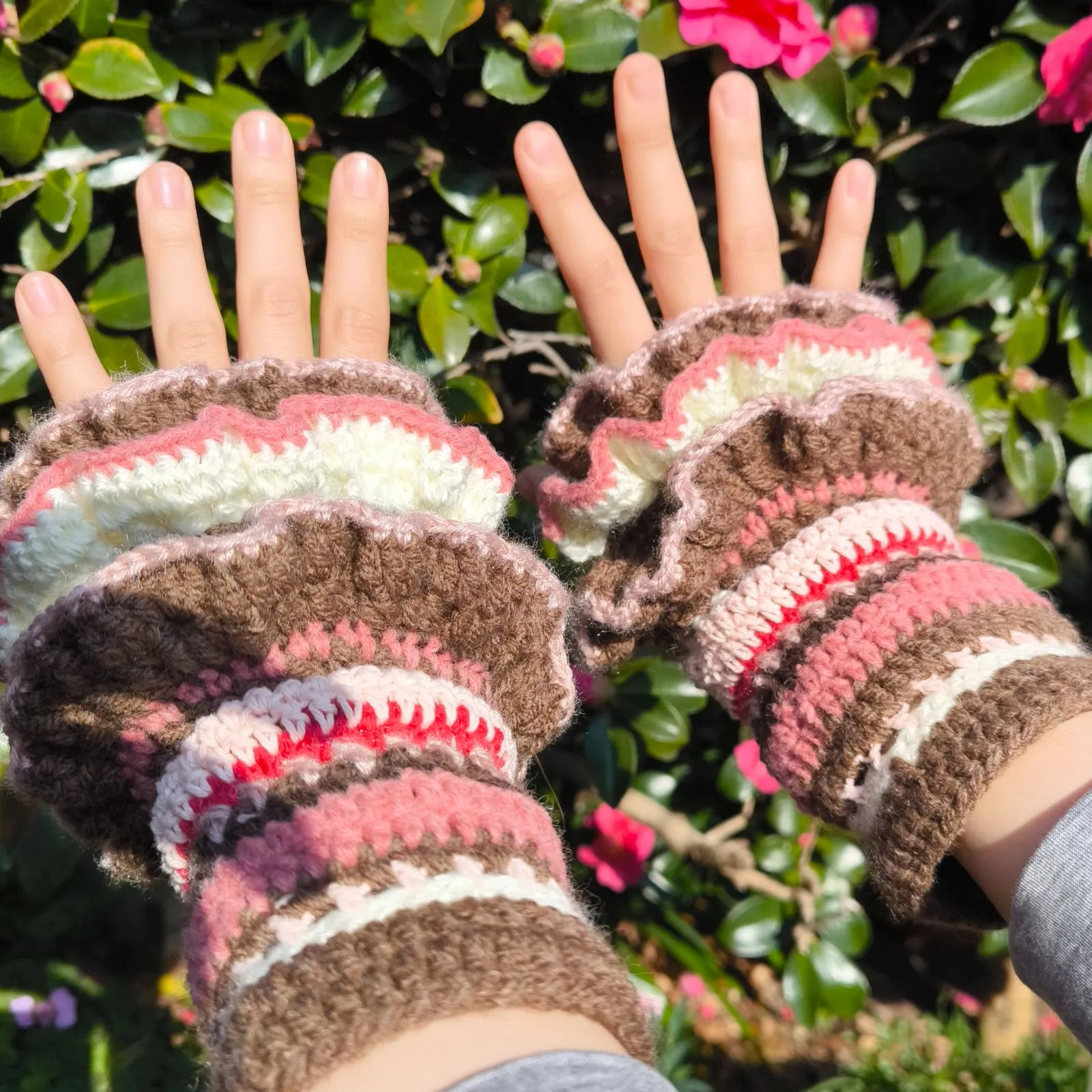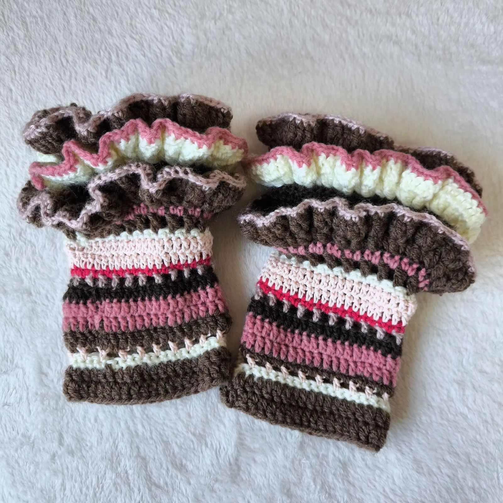 【ハンドメイド】ベリーショコラ色*フリルたっぷりアームウォーマー(ピンク×ブラウン)