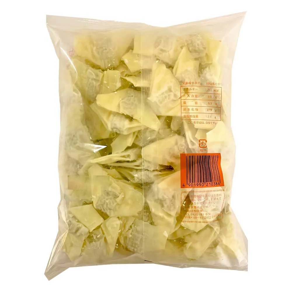 ■原材料名 皮(小麦粉(国内製造)、小麦たん白、食塩)、豚肉、オニオンソテー、卵白、醤油、でん粉、コーン油、生姜、ごま油、味噌、香辛料、食塩/調味料(アミノ酸)、かんすい、クチナシ色素(一部に小麦・卵・ごま・大豆・豚肉を含む)