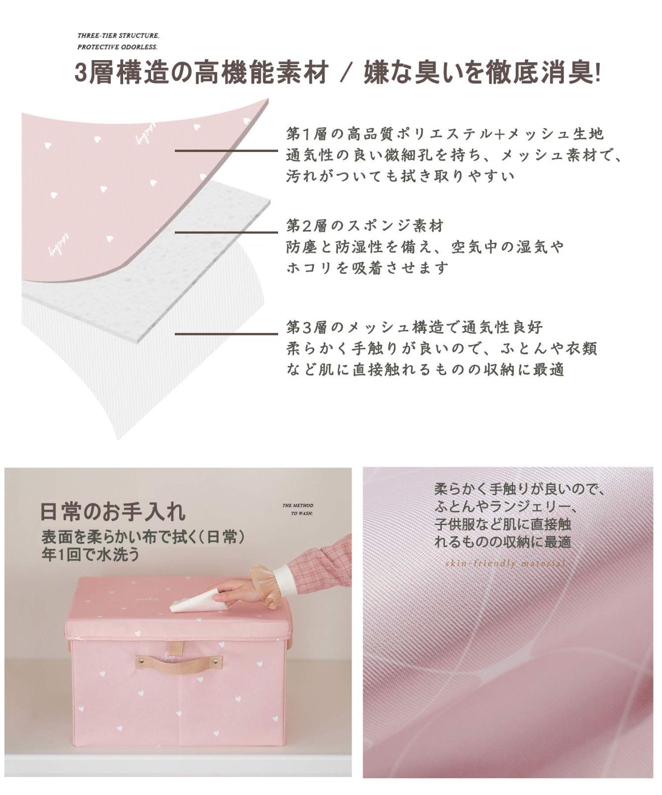 【3層構造の高機能素材】第1層の高品質ポリエステル+メッシュ生地で、通気性の良い微細孔を持ち、汚れがついても拭き取りやすい。第2層のスポンジ素材で、防塵と防湿性を備え、空気中の湿気やホコリを吸着させる。第3層のメッシュ構造で通気性良好、柔らかく手触りが良いので、ふとんやランジェリー、子供服など肌に直接触れるものの収納に最適。