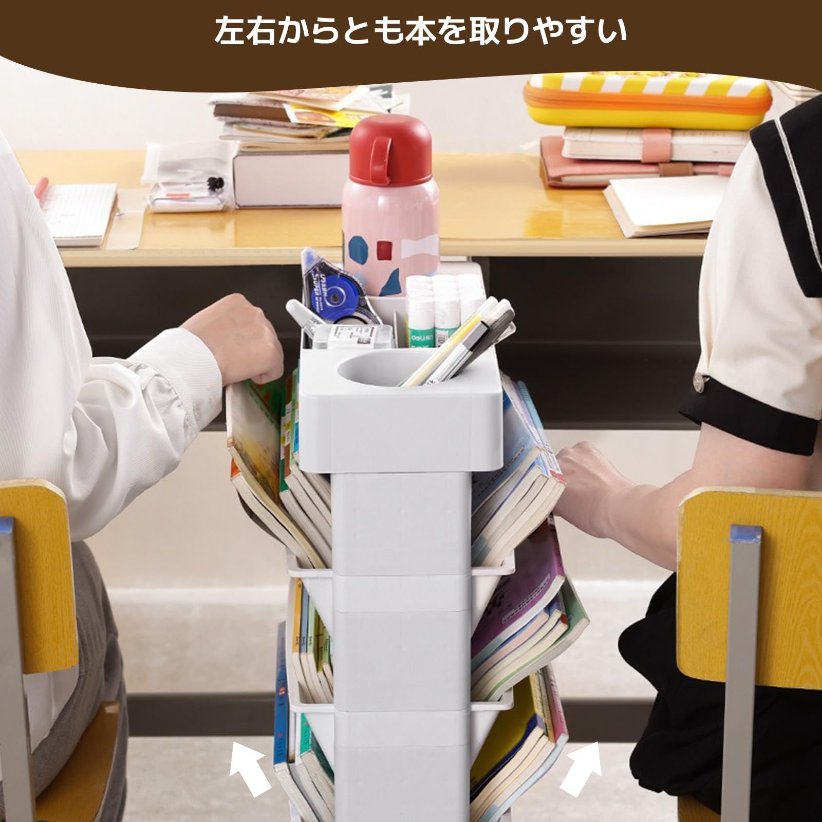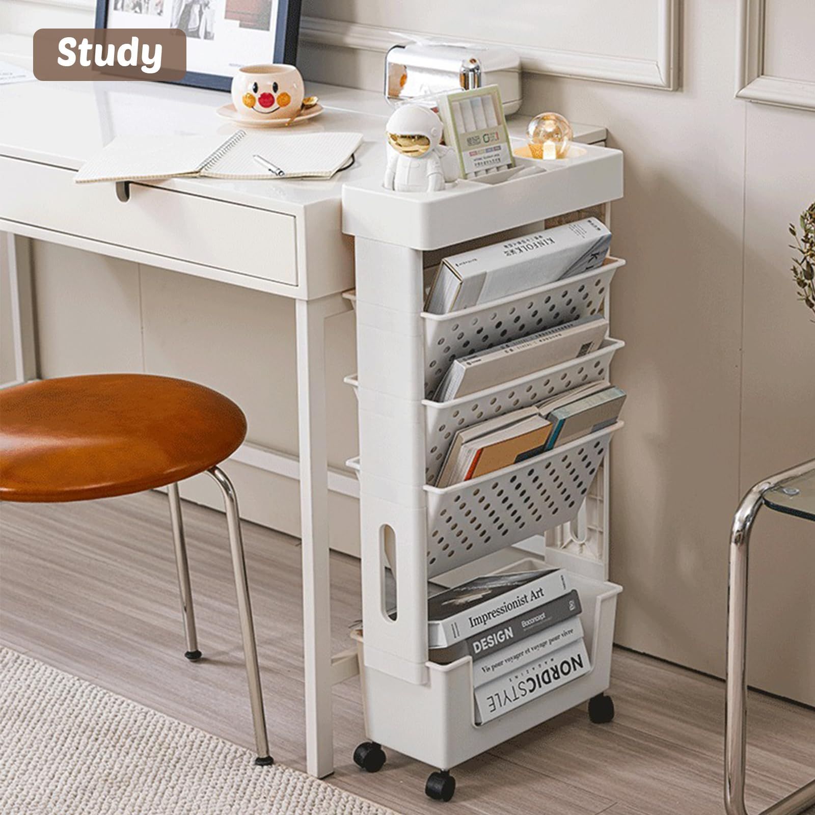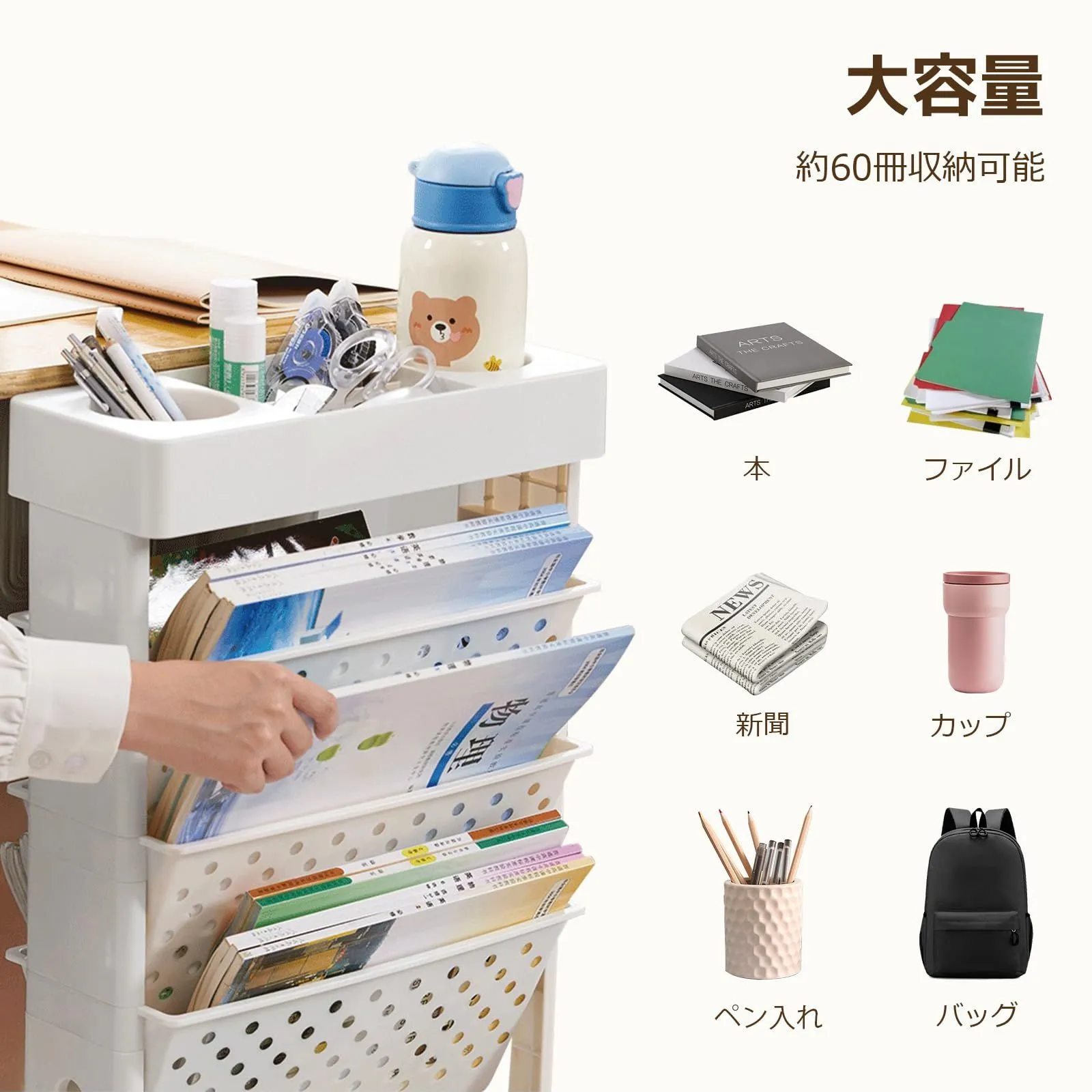 【多機能ゾーニング】5段のファイルワゴンとして、各棚耐荷重は約15kg、各段が様々な機能があります。まず、上段には水筒などに適用している丸い溝があって、もちろんペン立てとしてもピッタリです。そして、実用的な3段の棚は、教科書や漫画、絵本、マガジン、ファイル、CDなどをきちんと収納できます。底部は空間が大きいので、サイズ合う物をなんでも収納できます。