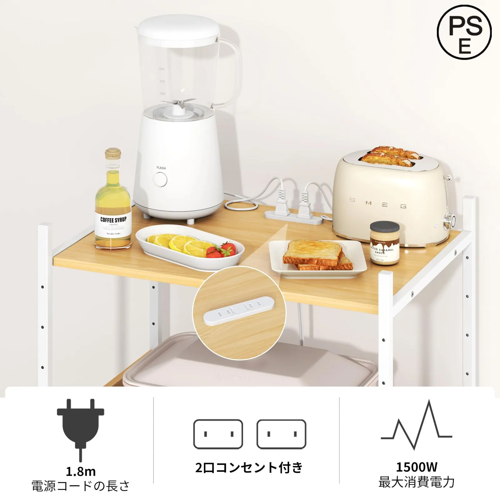 【便利なコンセントとキャスター付き】コンセント付きでミキサーや電気ケトルなどのキッチン家電をスマートに配置でき、コンセントを探す手間なく、調理や作業がスムーズに行えます。脚部にはキャスターが付いているため、お掃除の際やレイアウト変更の際も、ラックを簡単に移動できます。