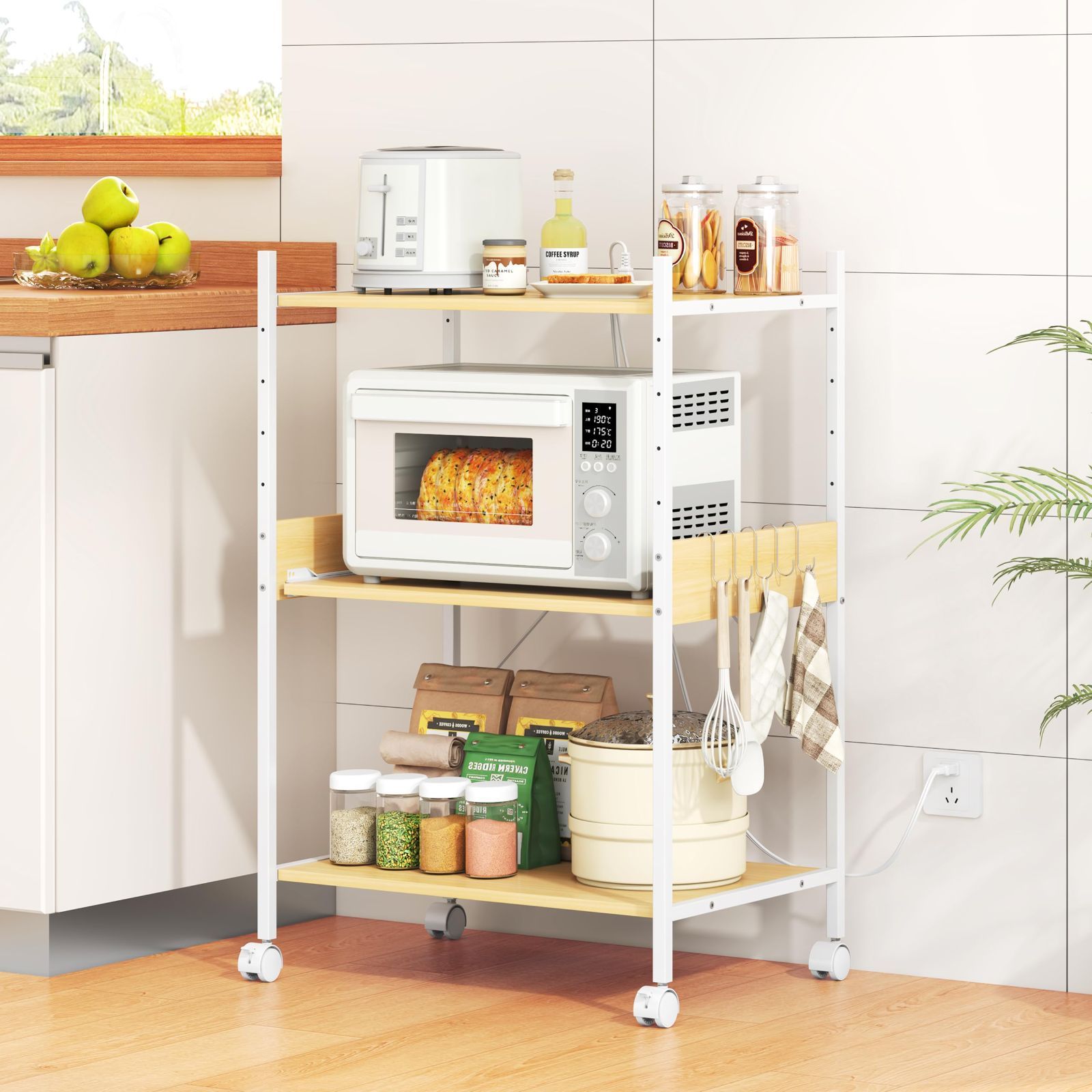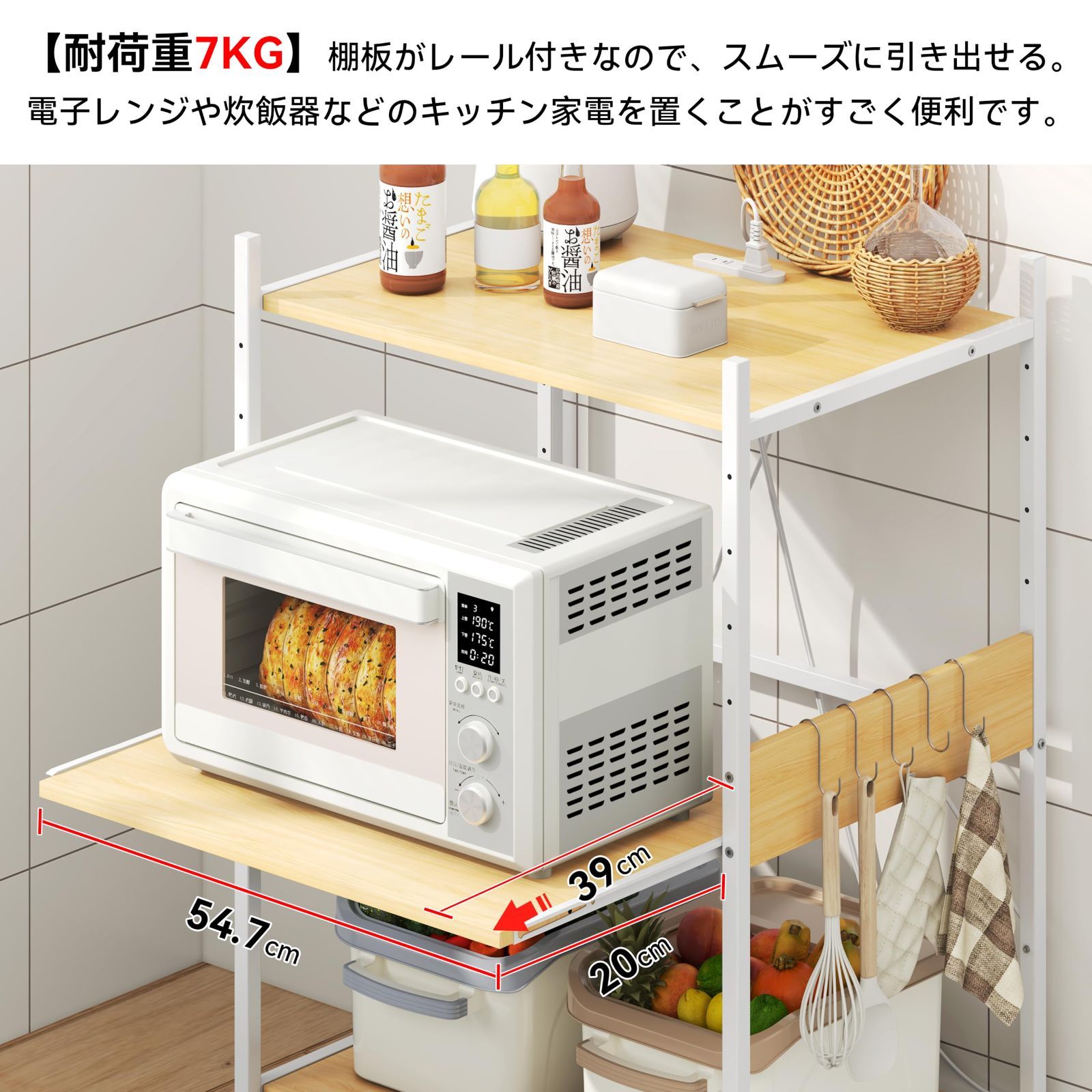 LunarLight レンジラック レンジ台 幅60奥行き44高さ91.5cm 高さ5段調節可能 コンセント・Sフック付き キャスター・アジャスター付き 移動式と固定式2機能 サイドパネル付き 総耐荷重112kg キッチン棚 スライド棚 大型レンジ対応 キッチン収納 オーペンラック おしゃれ 頑丈 スリム 強度安定 錆び防止 耐摩耗性 防水性 耐熱性 (ナチュラル)