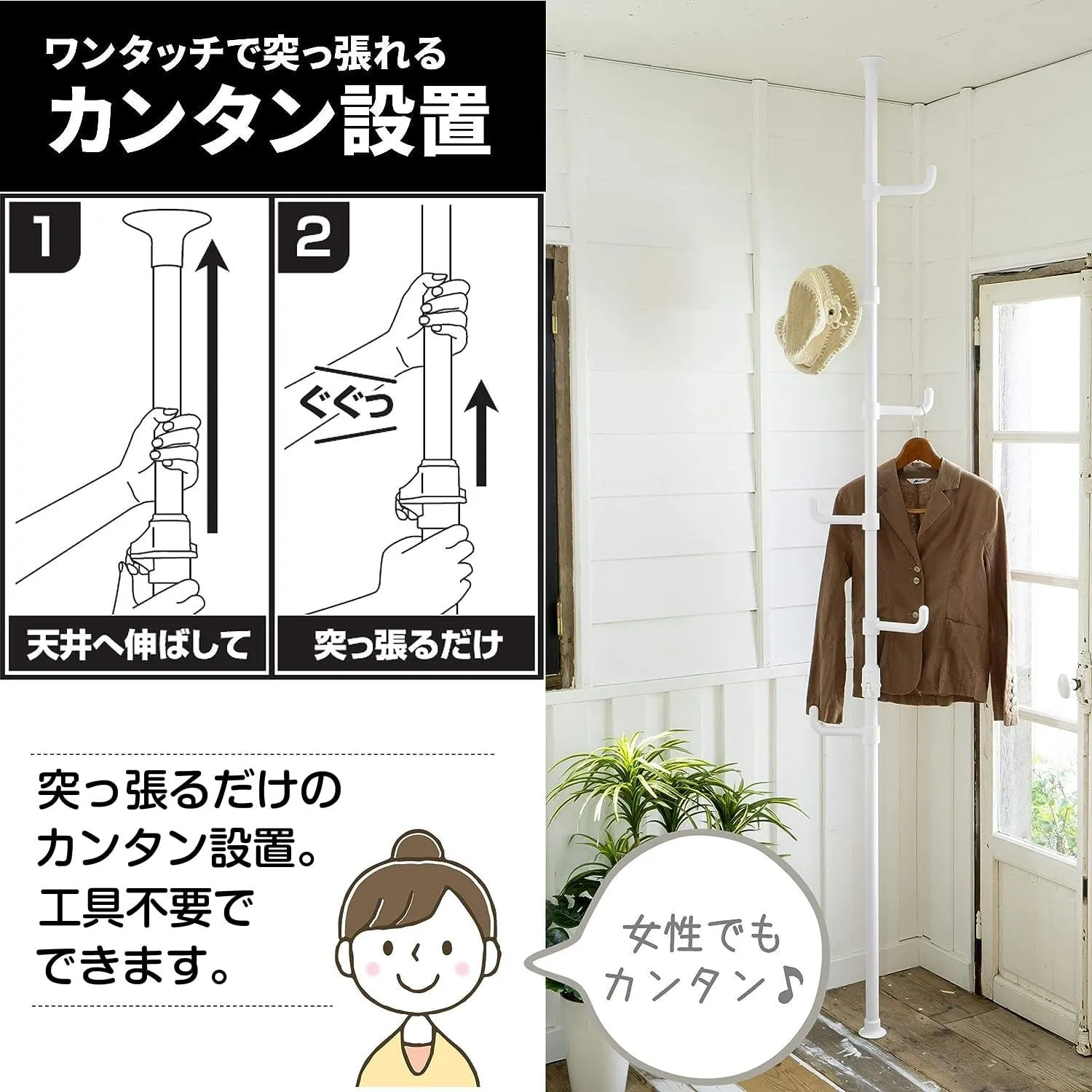 ●実用新案取得済みのワンタッチ突っ張り構造でカンタンに設置ができる