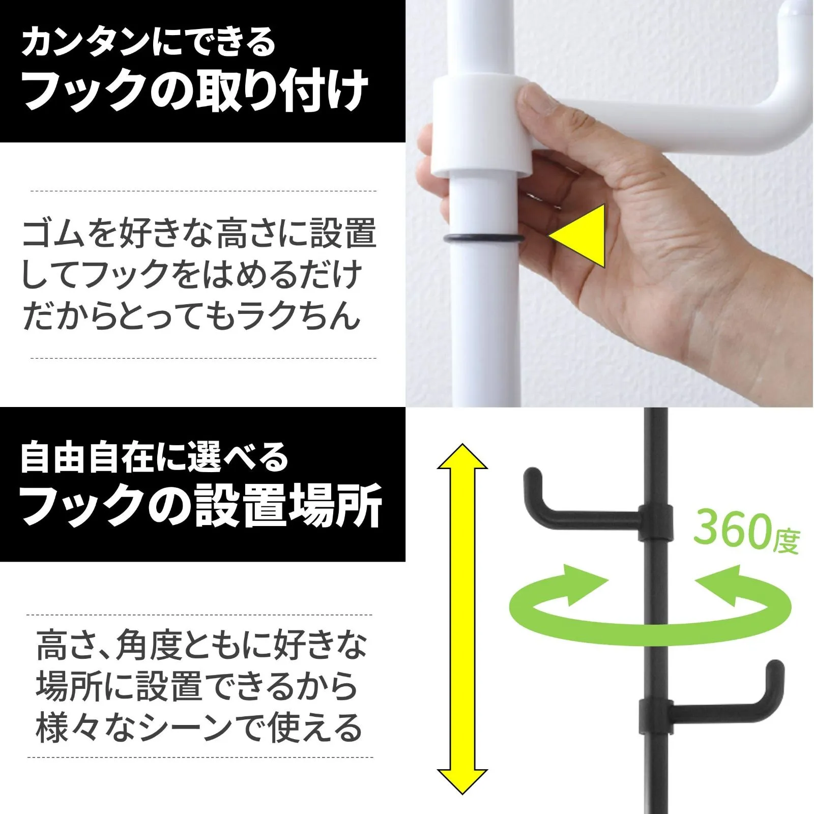 ●フックは高さ、角度ともに好きな場所に設置できる※下段のフック設置は1つまで