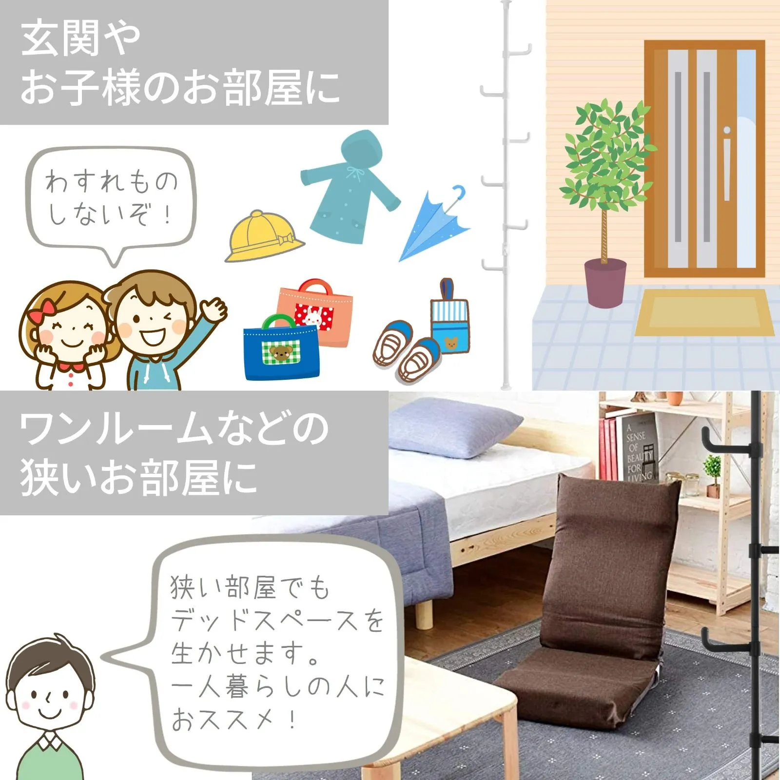 ●お部屋や玄関などのデッドスペースを収納スペースにできる、突っ張り式のポールハンガー