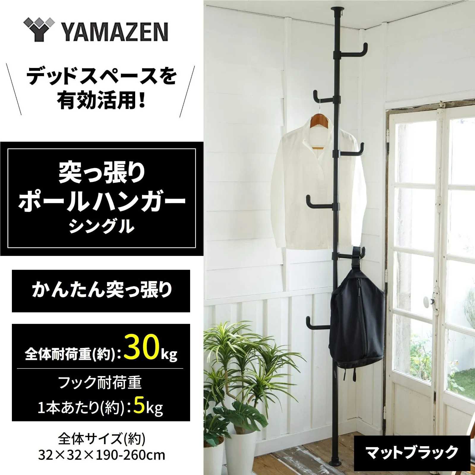 在庫処分 ワンタッチ突っ張り (実用新案取得済) 高さ190-260cm 全体耐荷重30kg コートハンガー ポールハンガー 玄関収納 一人暮らし ラック 子供部屋 組立品 突っ張り マットブラック WJ-725RM(MBK) 山善(YAMAZEN) シングル